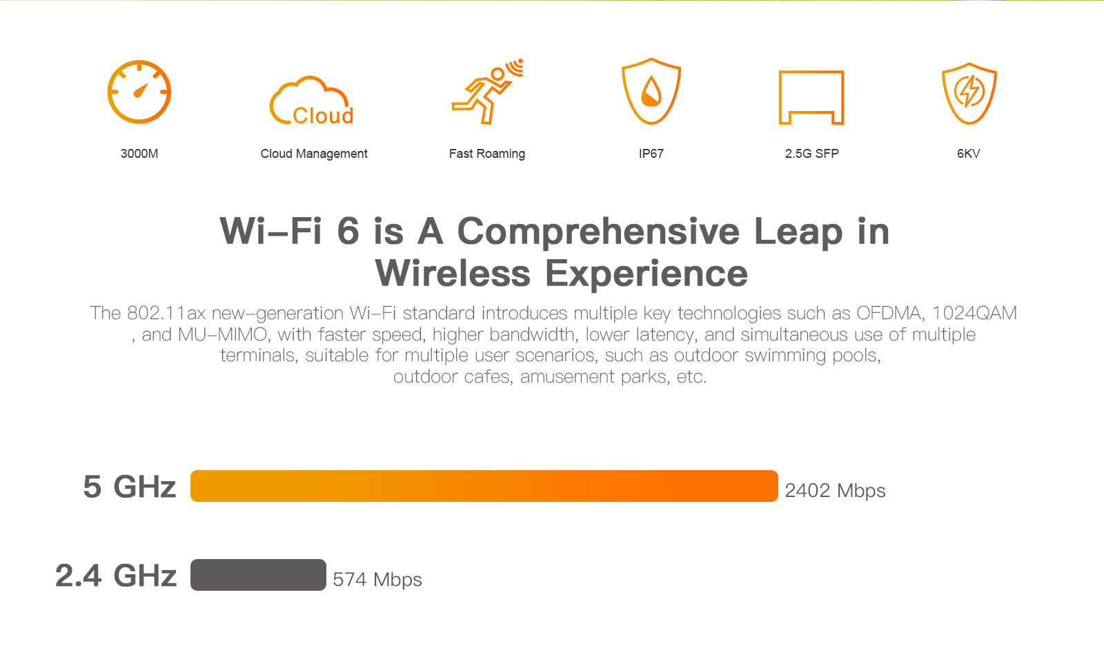 ● 574Mbps at 2.4GHz + 2402Mbps at 5GHz