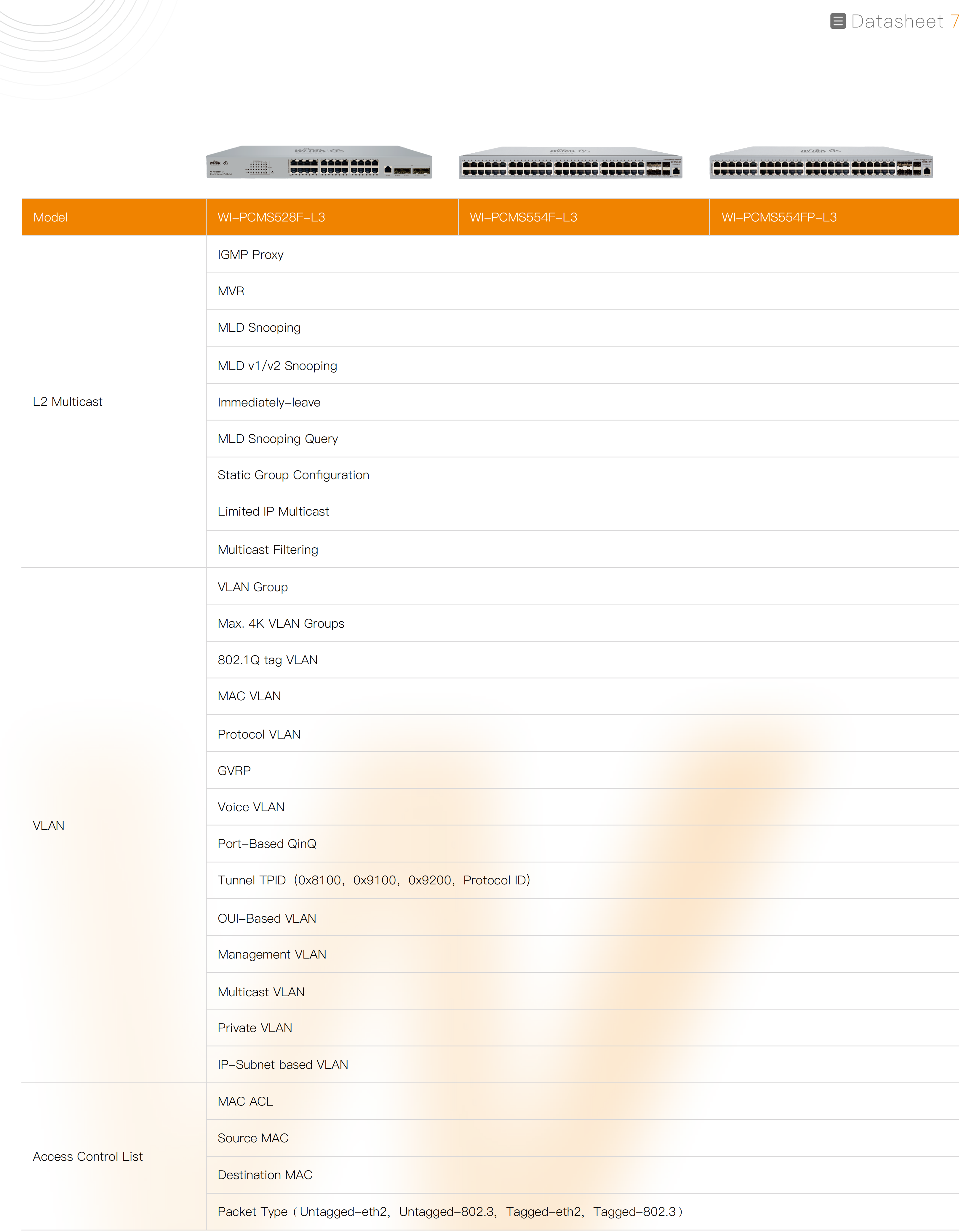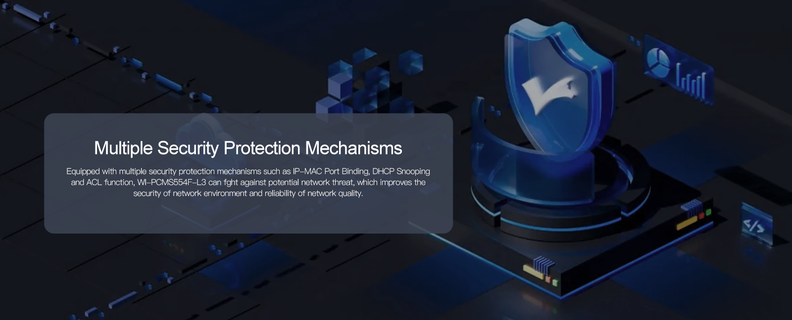● Reliable Security Functions: ACL, DoS Defend, DHCP Snooping,802.1X, IP-MAC-Port Binding