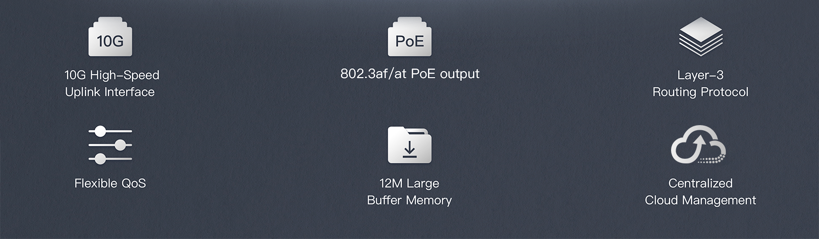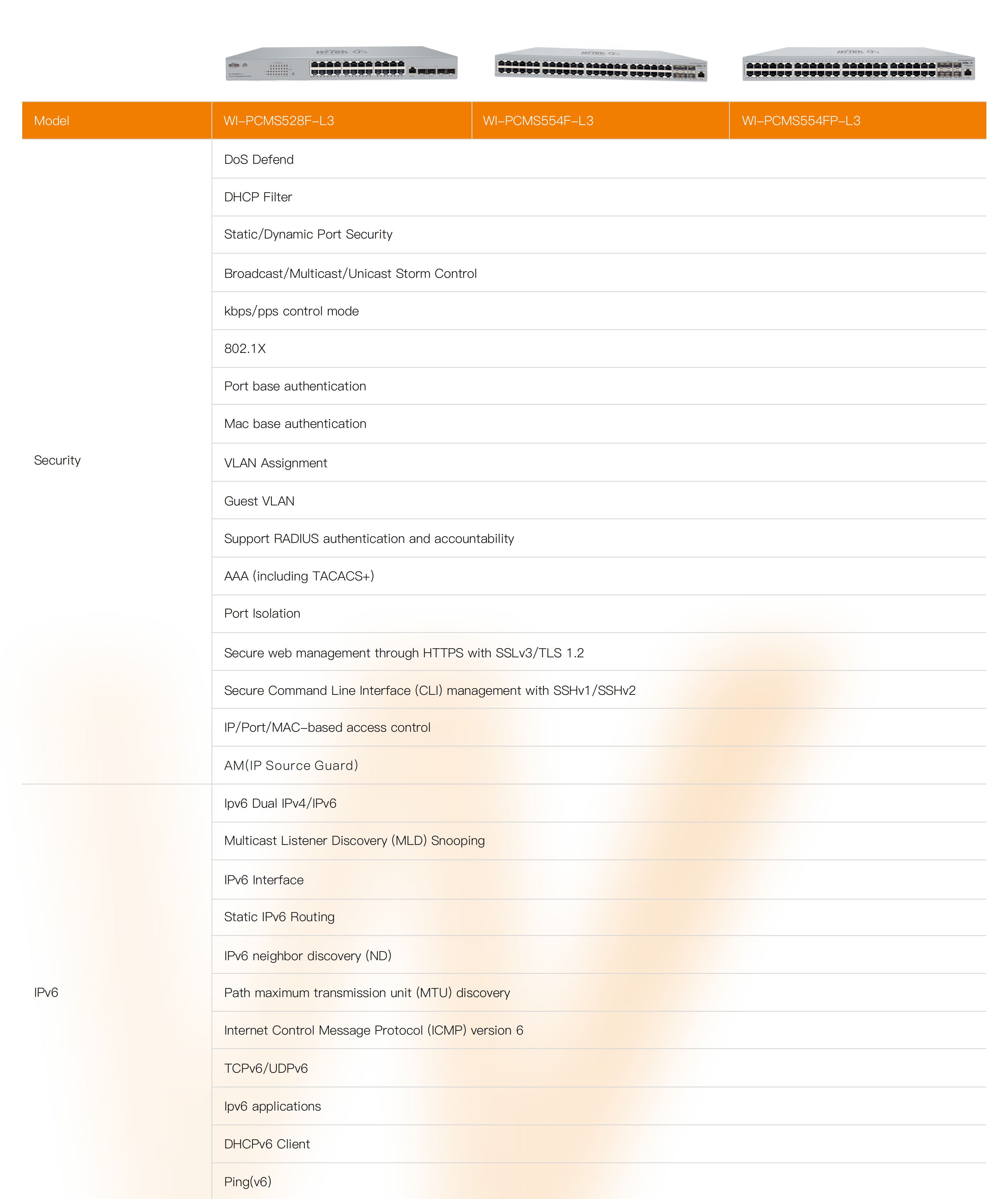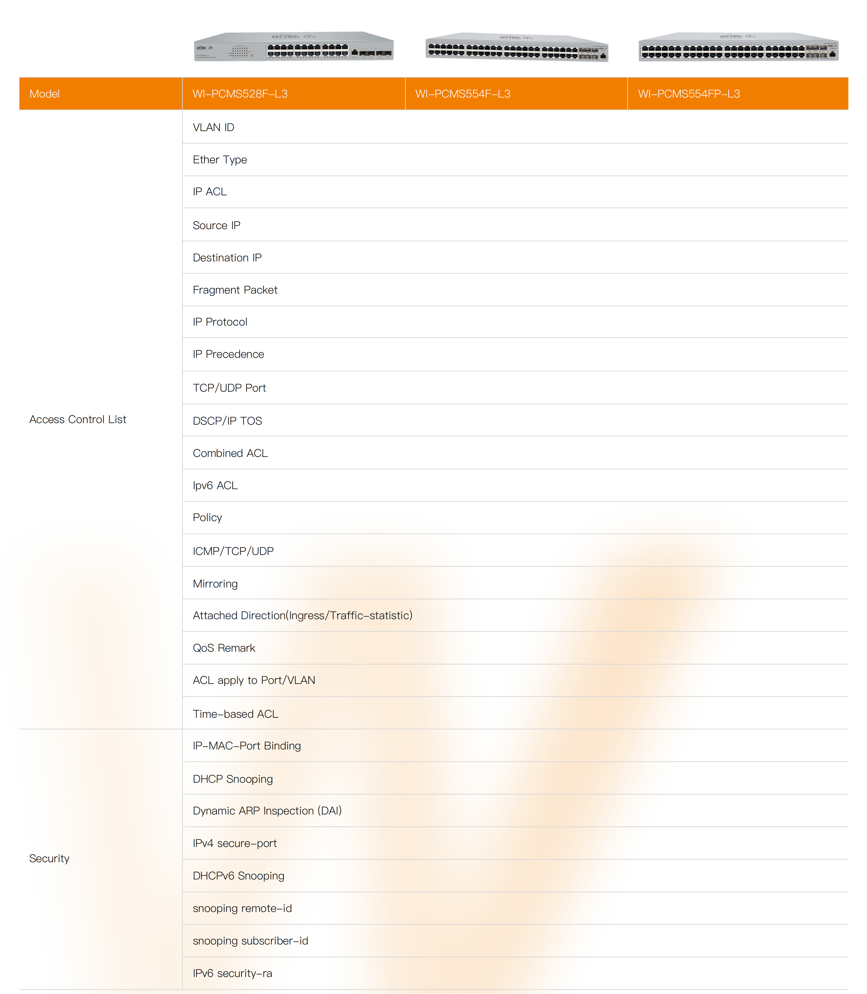 ● Reliable Security Functions: ACL, DoS Defend, DHCP Snooping,802.1X, IP-MAC-Port Binding