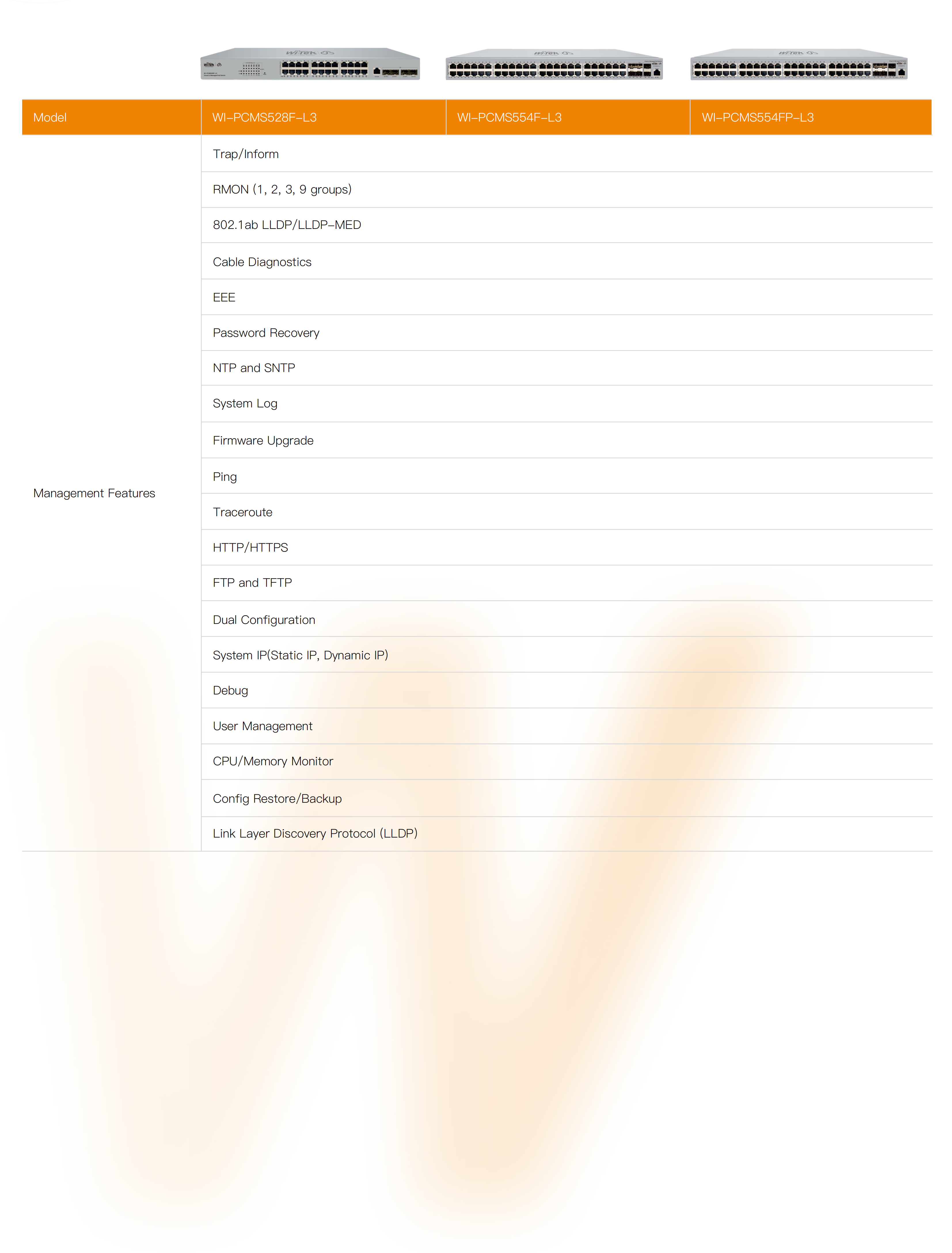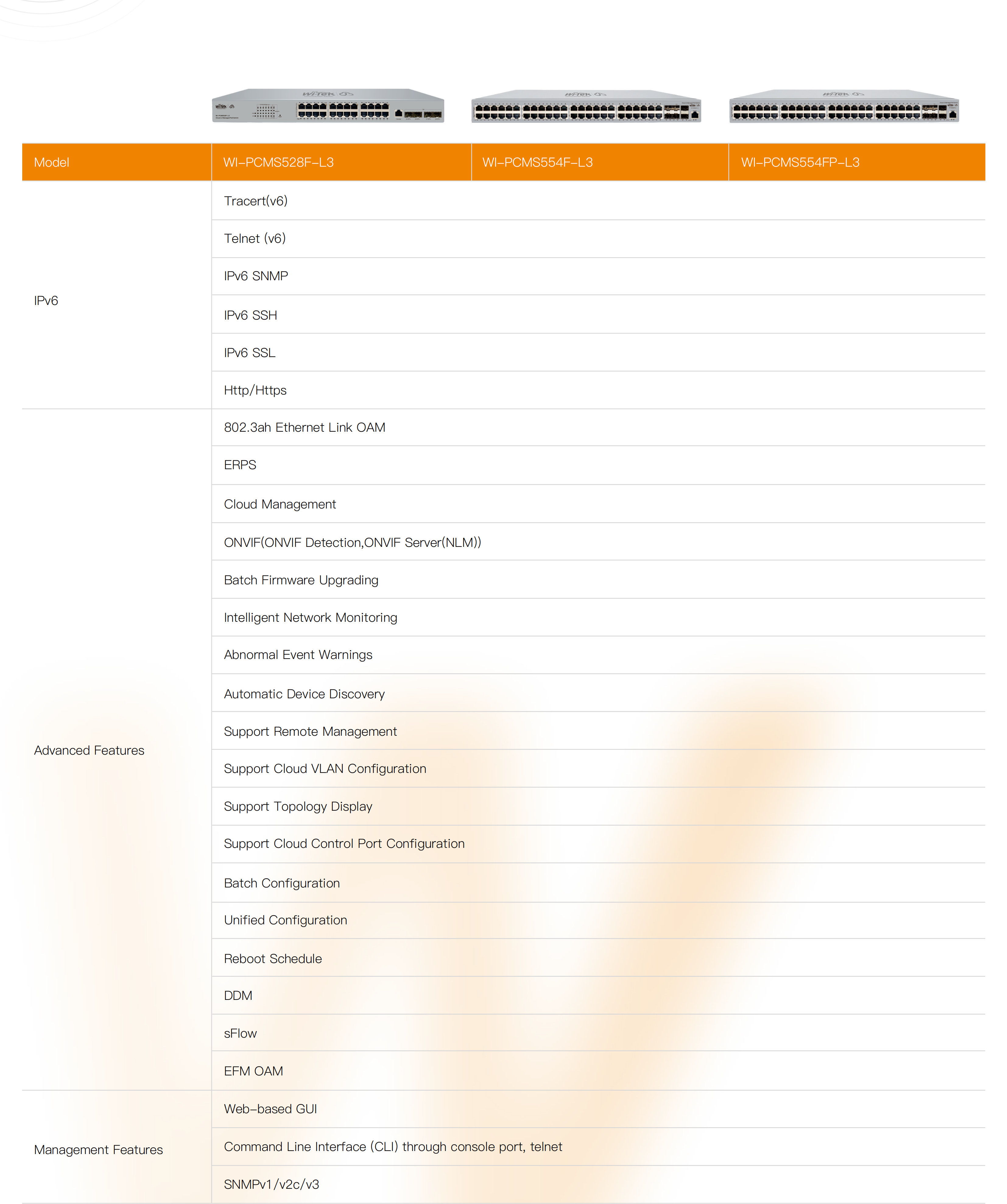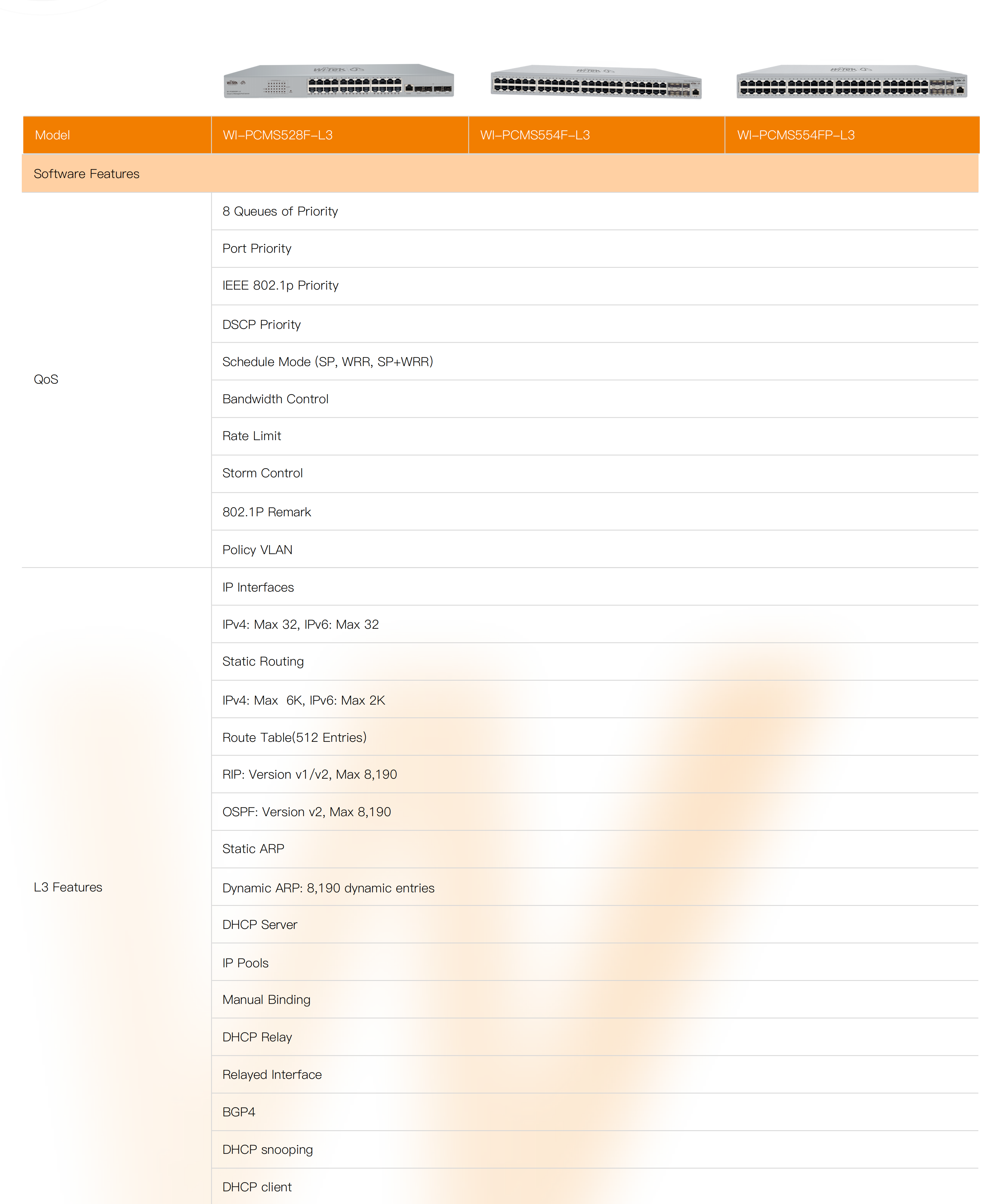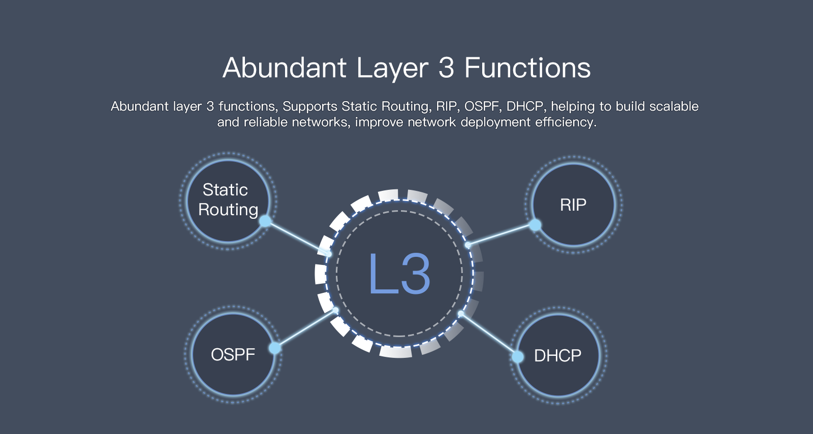 ● Abundant L3 Features: Static Routing, RIP, OSPF, DHCP Server/Relay