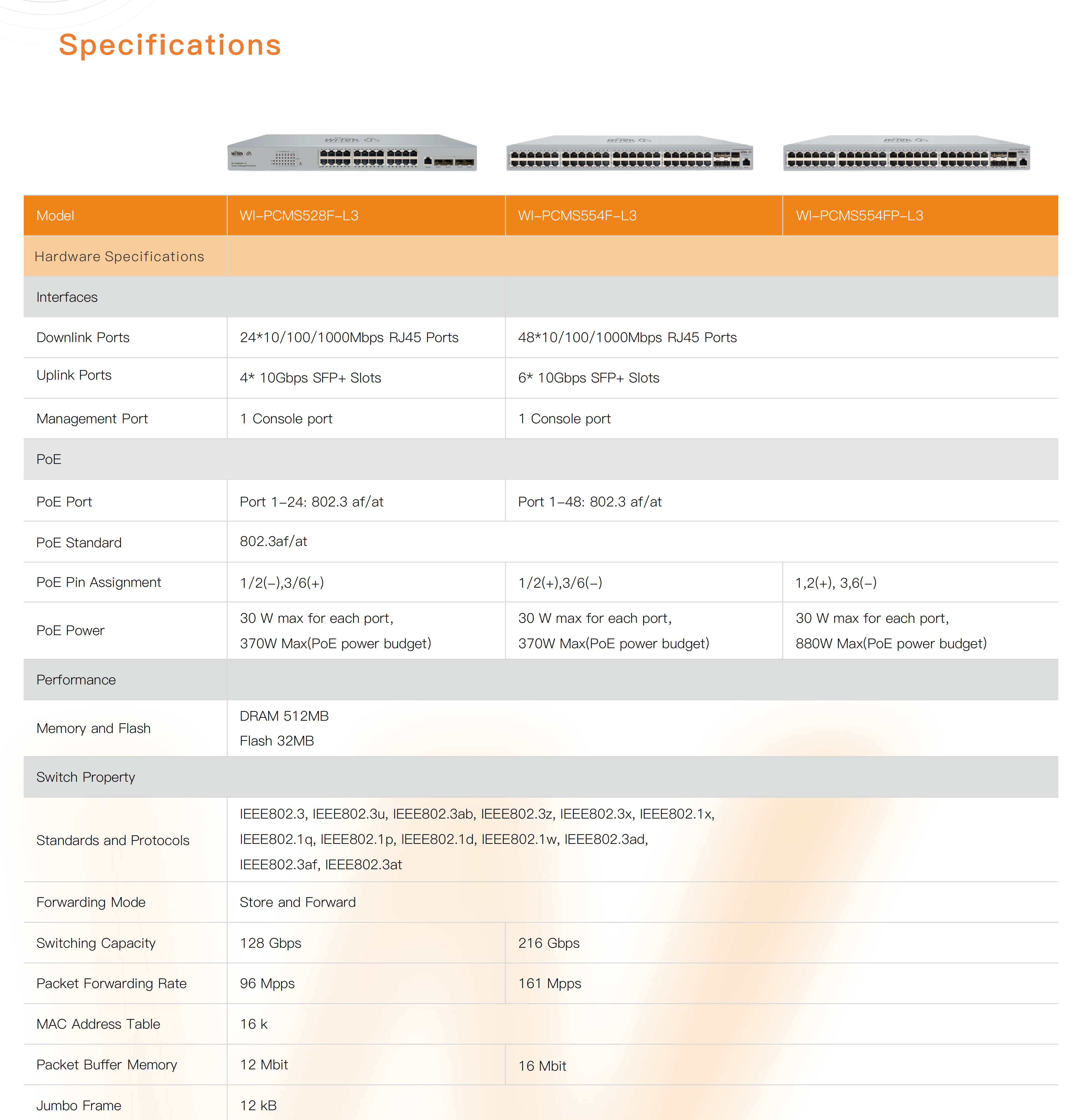 ● 48 Gigabit PoE+ RJ45 ports and 6 10Gbps SFP+ Slots