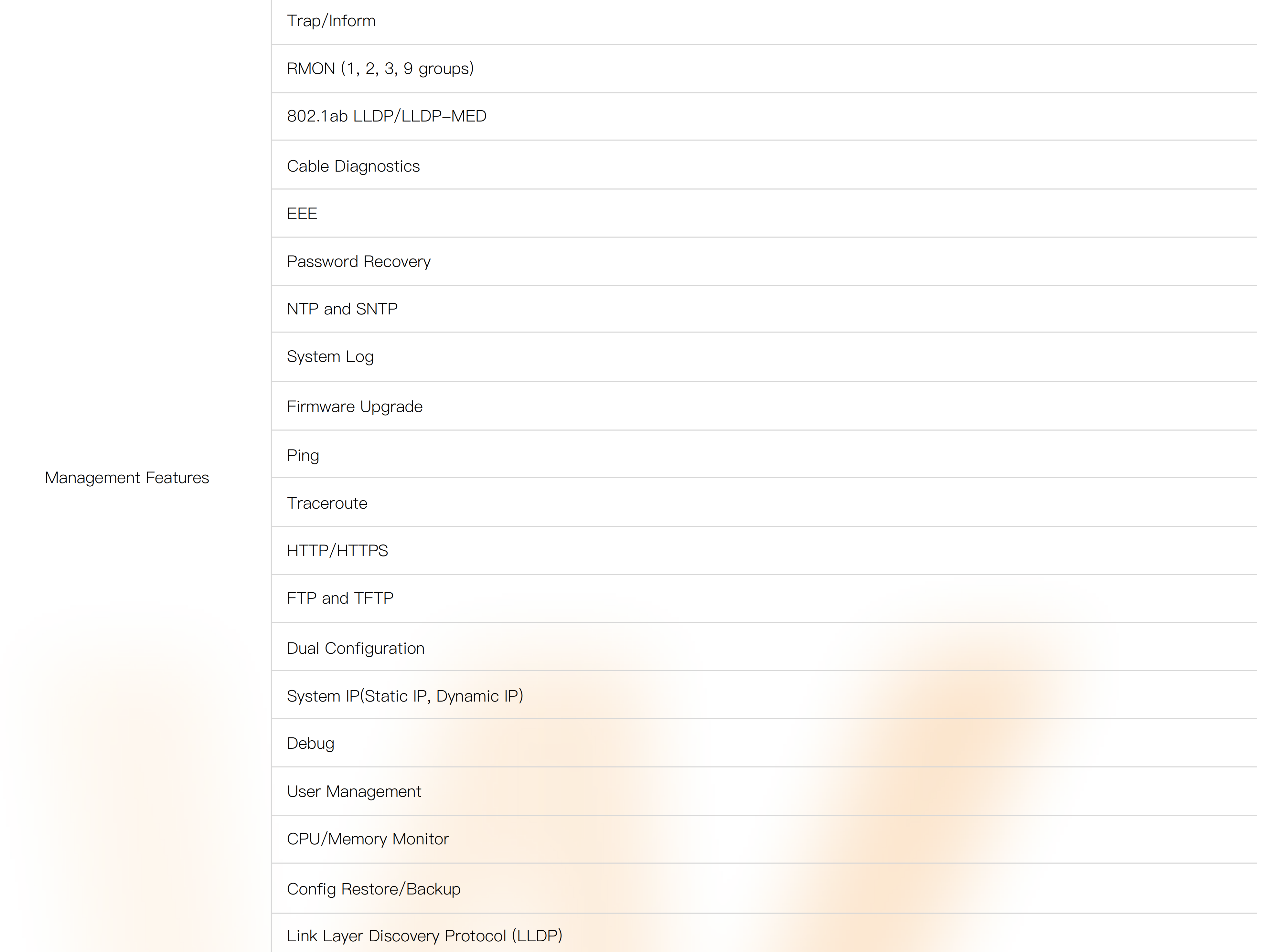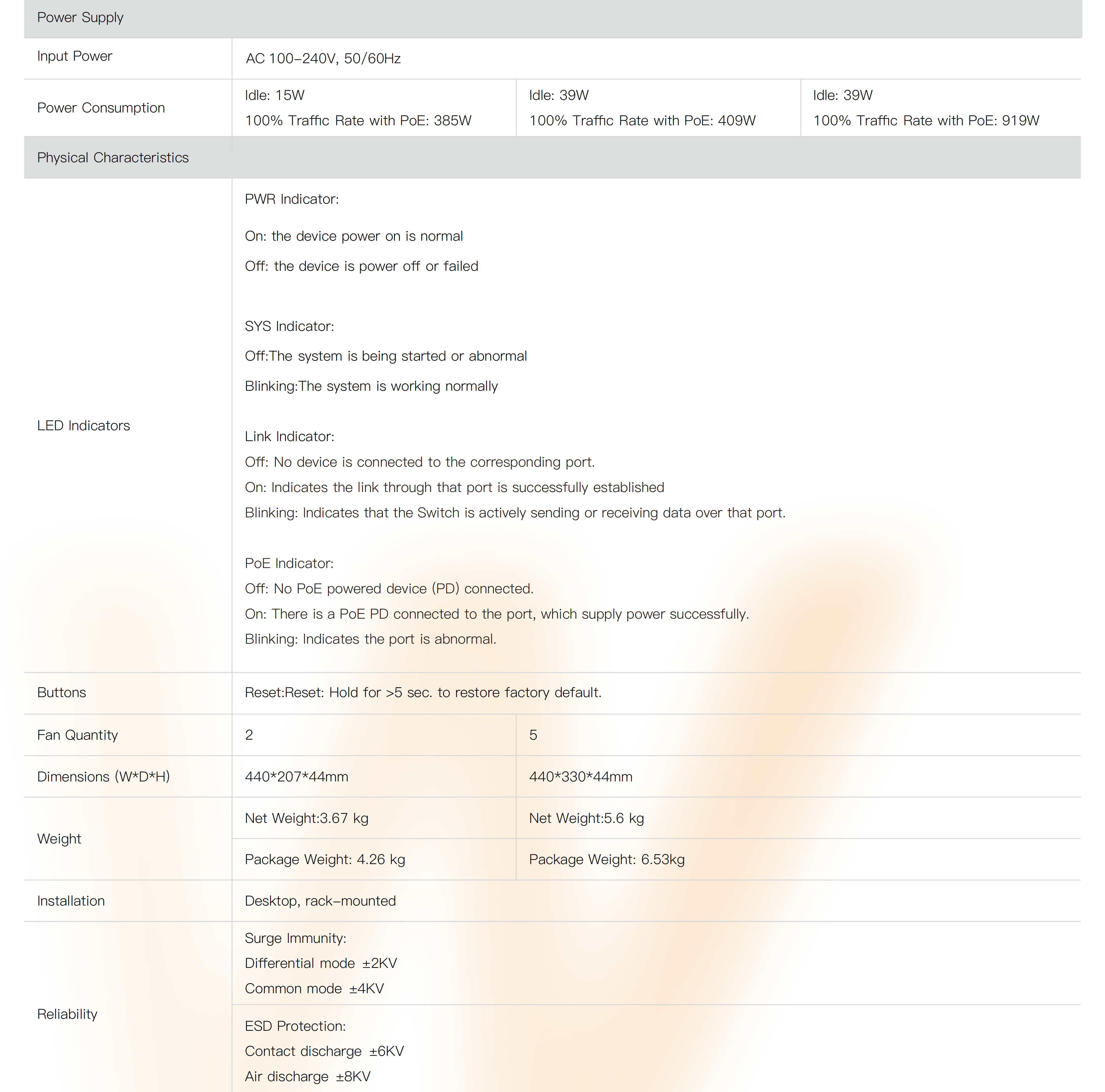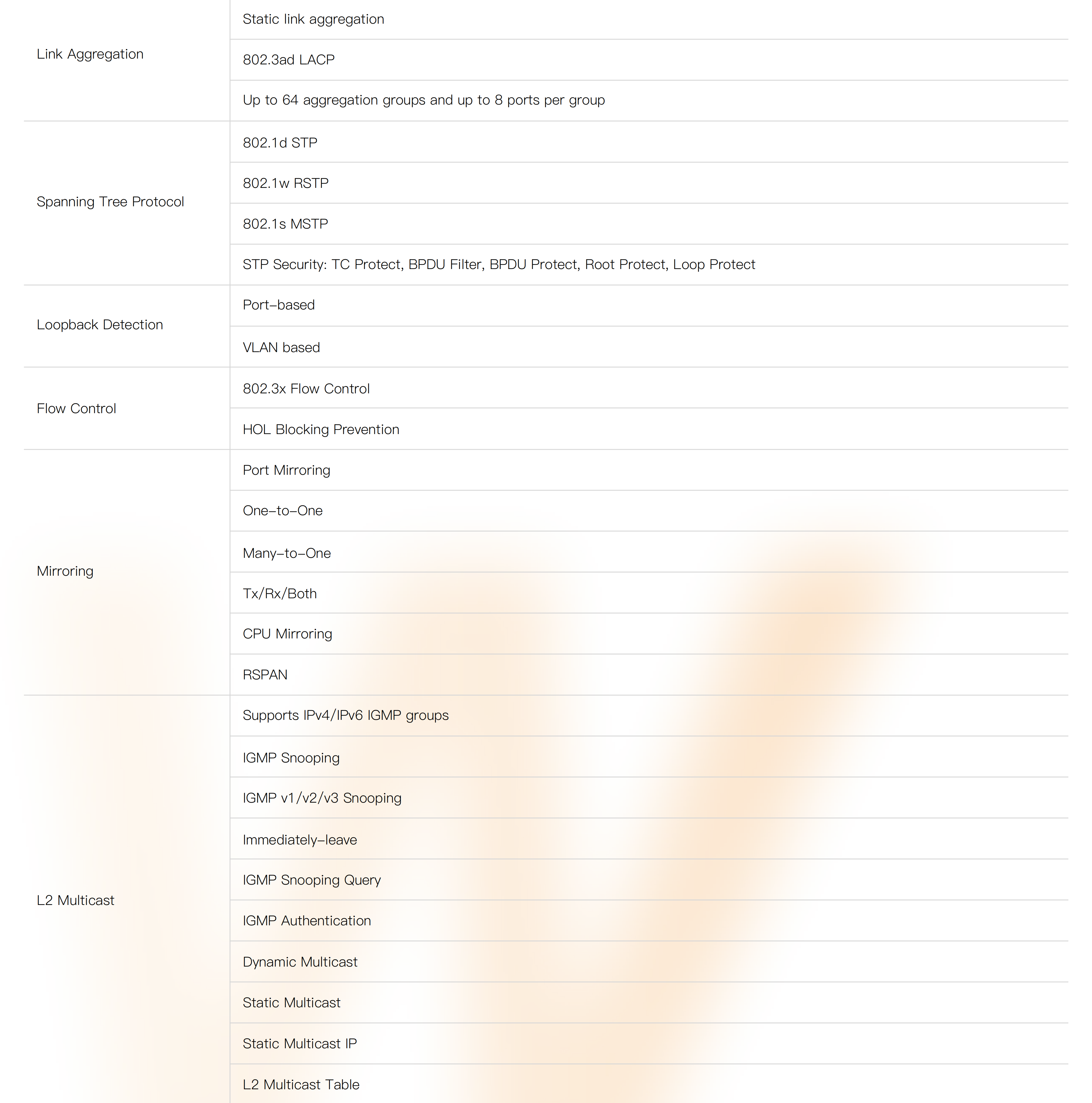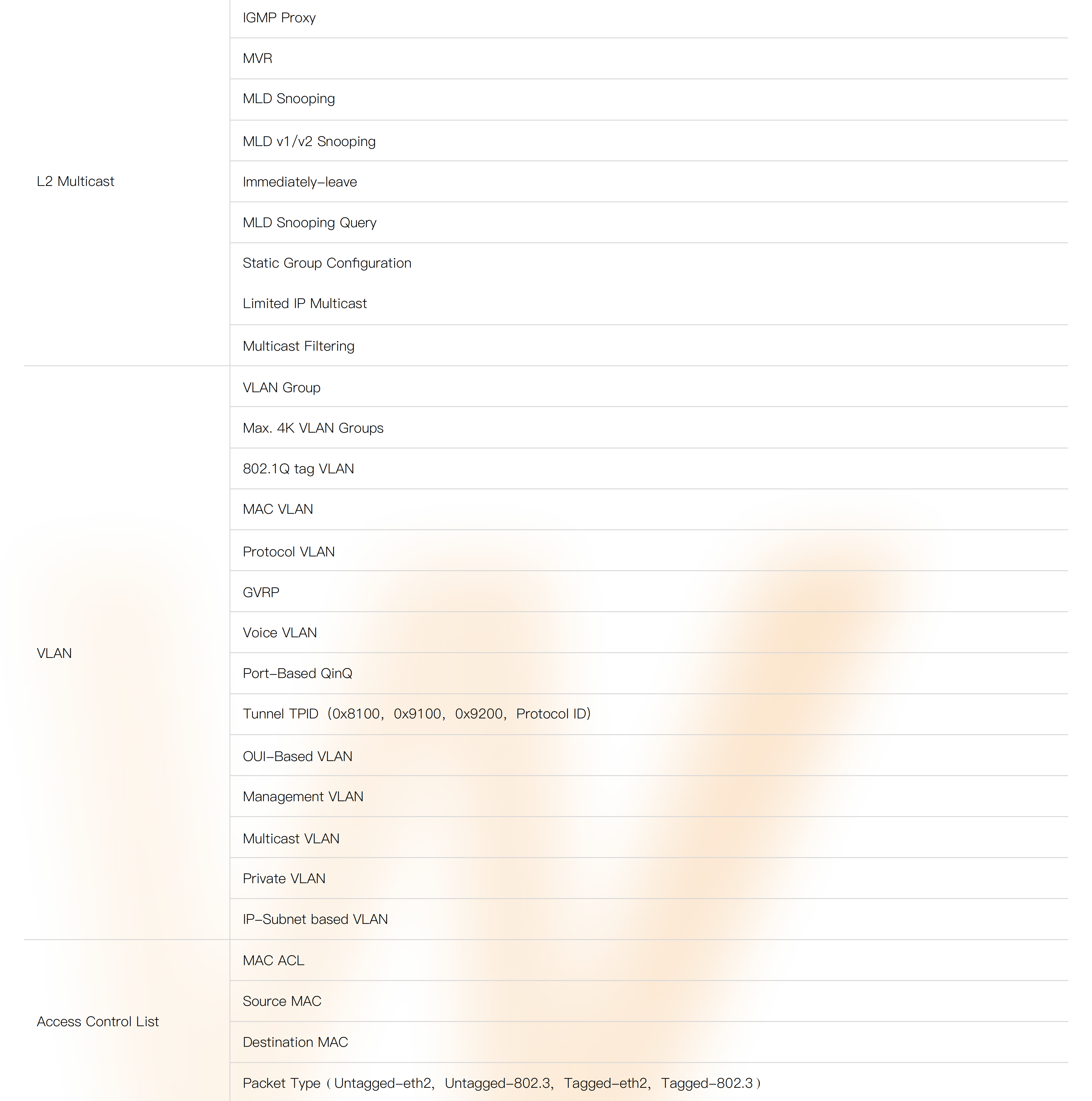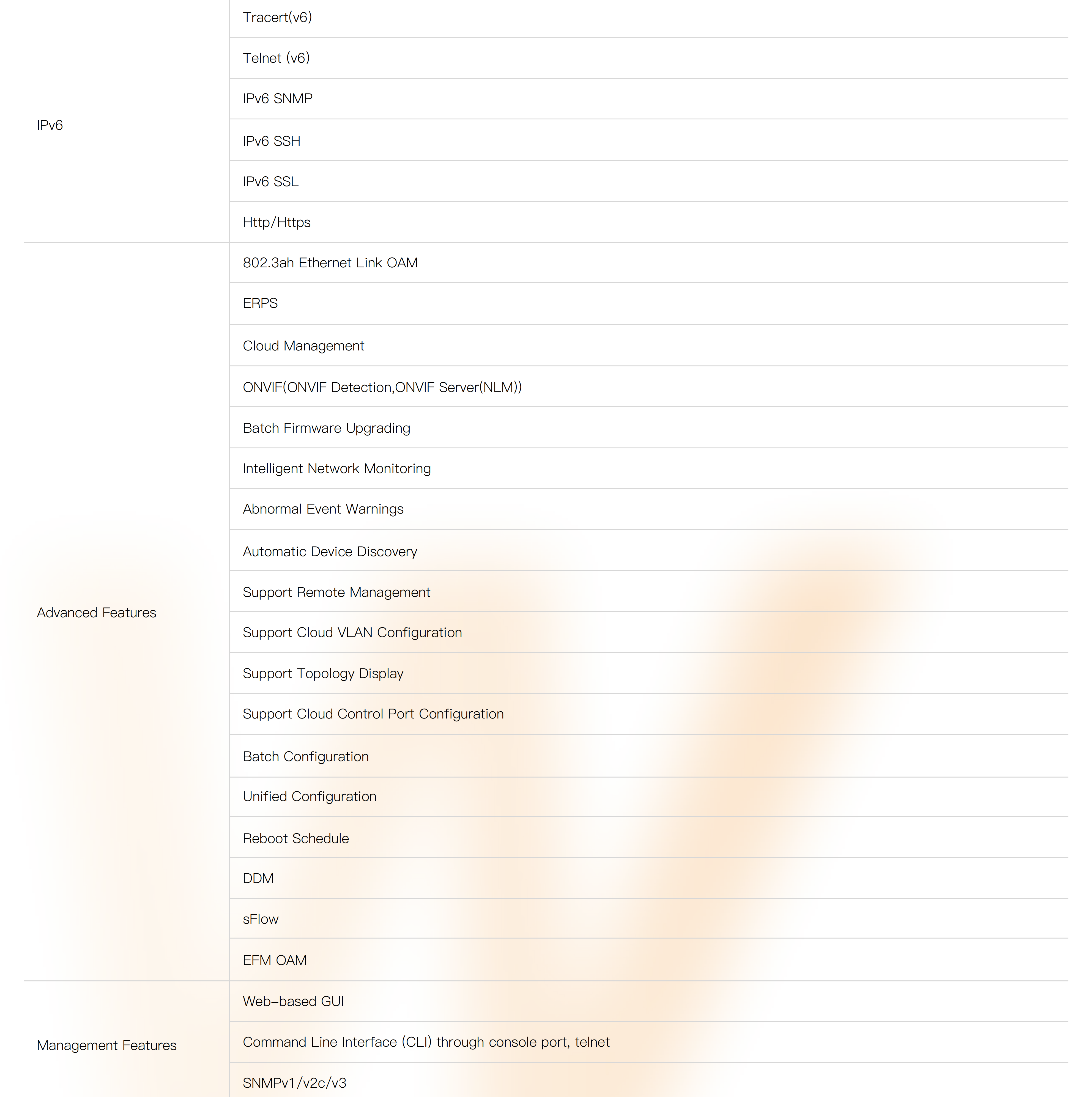 ● Reliable Security Functions: ACL, DoS Defend, DHCP Snooping,802.1X, IP-MAC-Port Binding