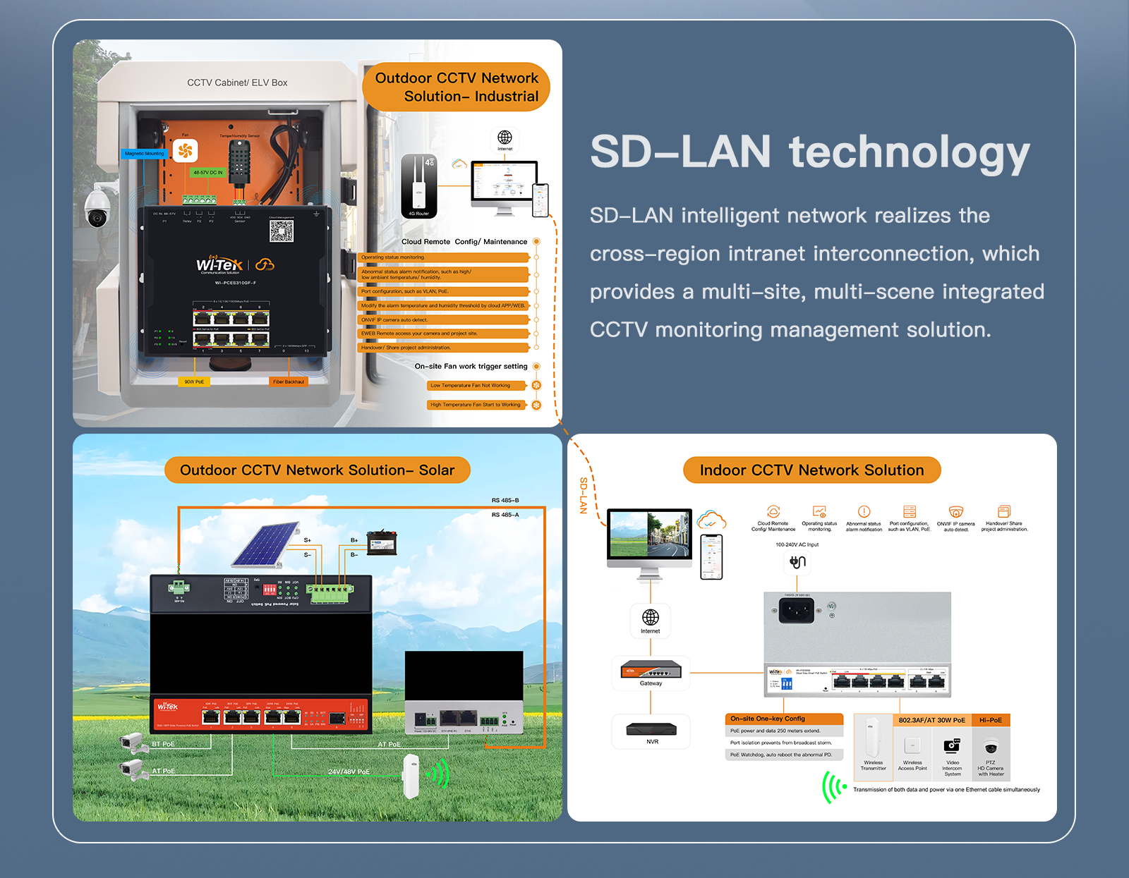 ● SD-LAN Networking provides a multi-site, multi-scene integrated CCTV monitoring management solution.