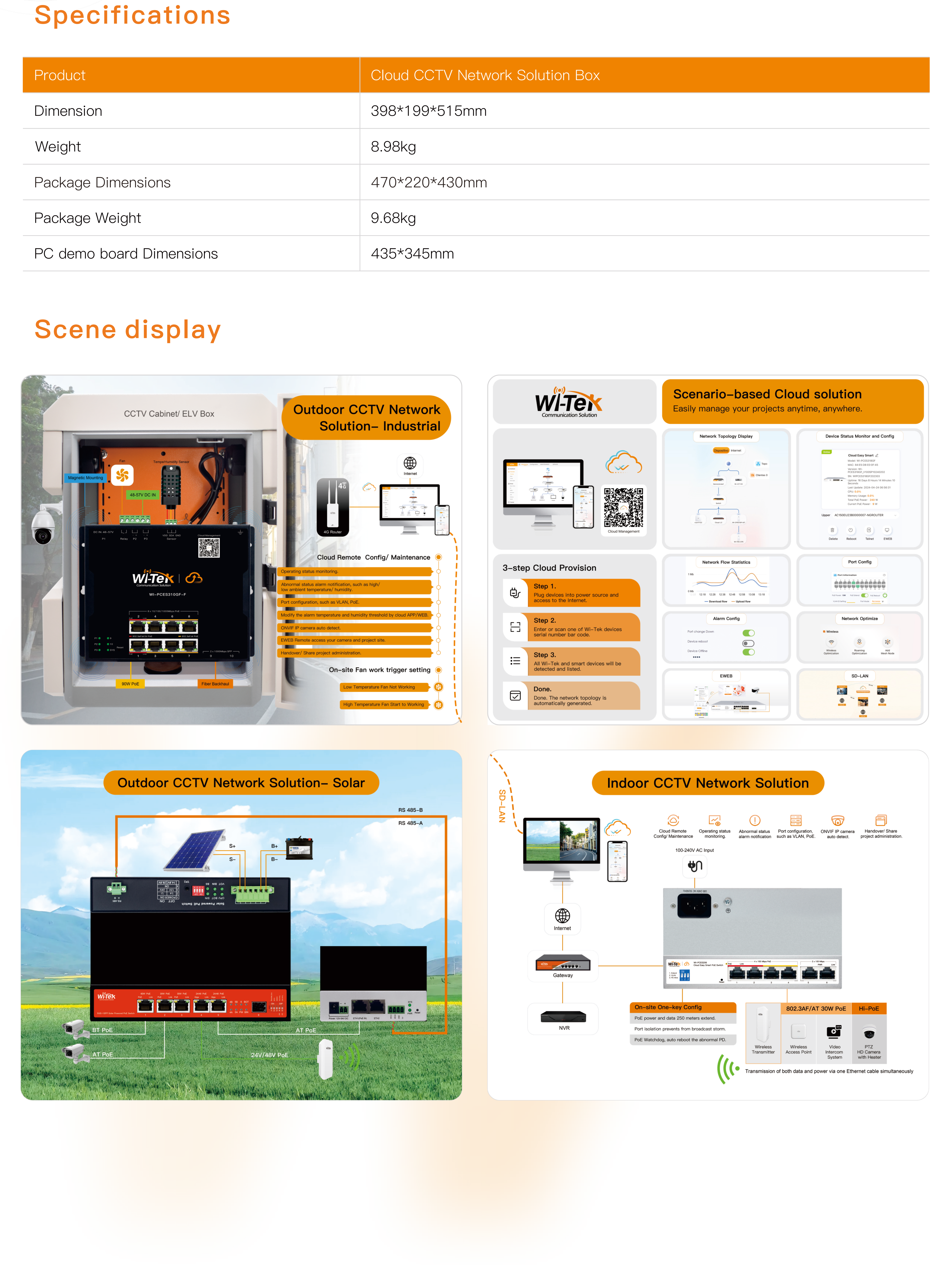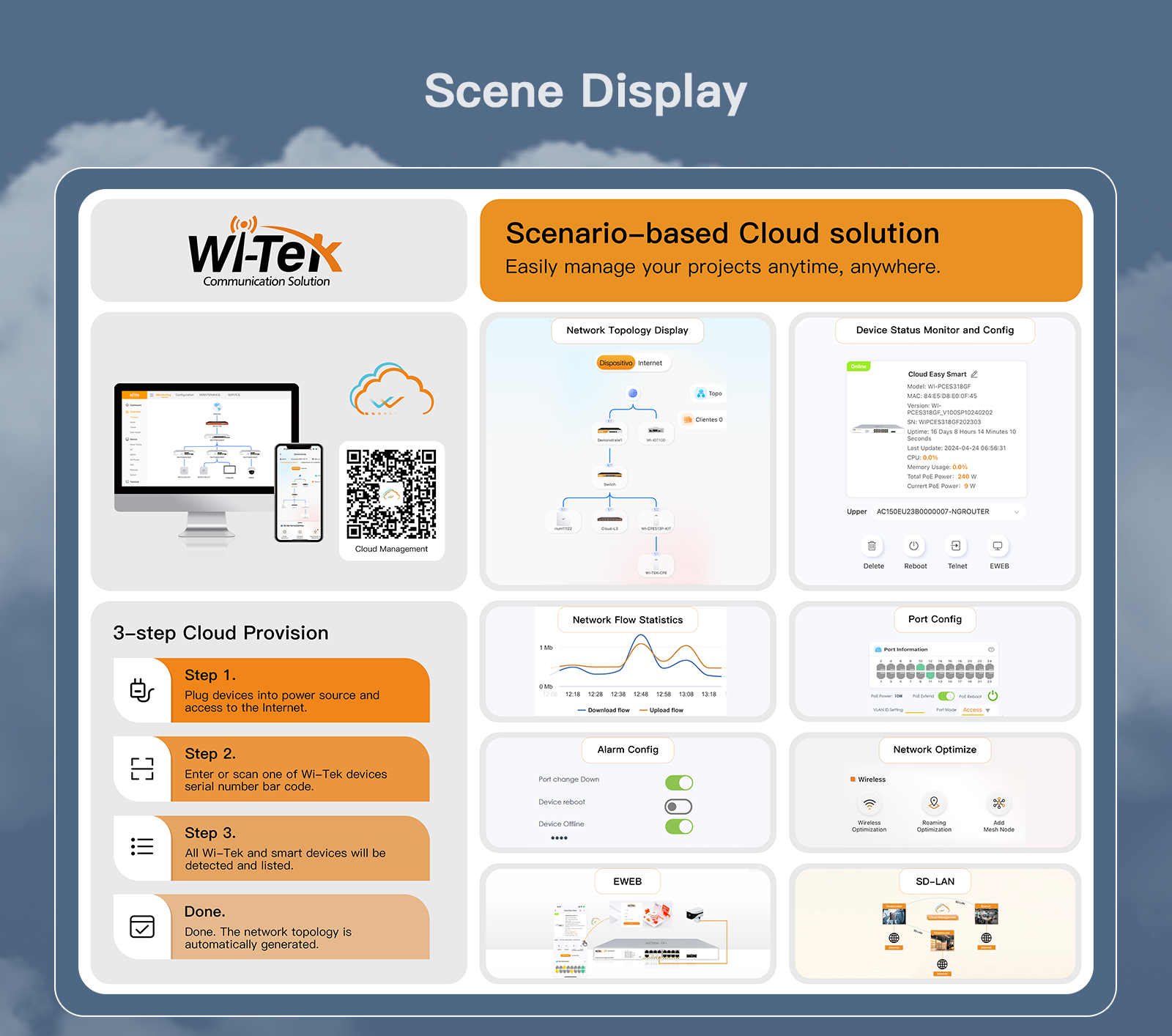 ● Scenario-based Cloud network solution meets indoor and outdoor environment needs, and you can access your network anytime, anywhere through Wi-Tek Cloud WEB/ Moblie APP.