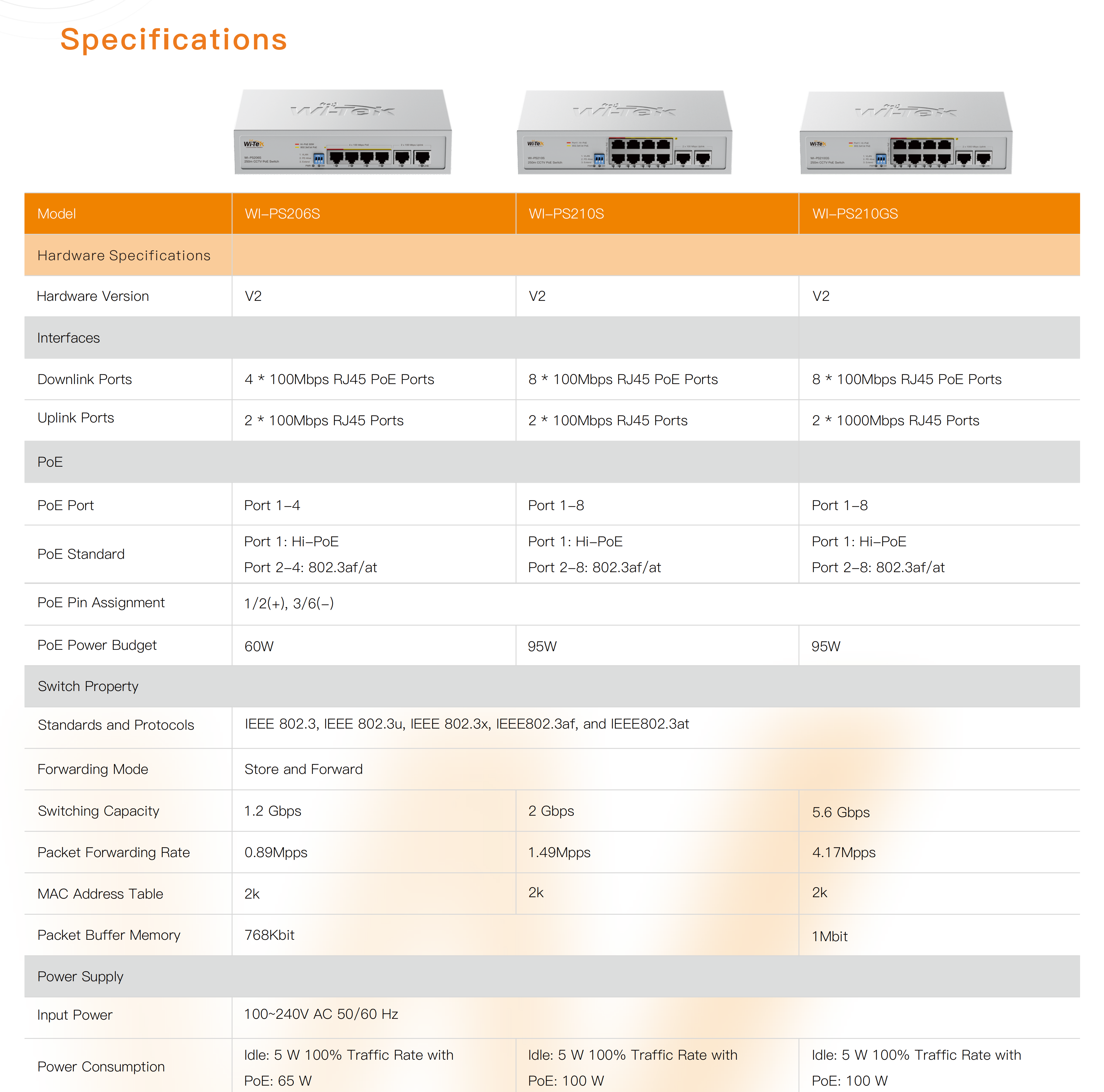 ● 4 x 10/100Mbps PoE Ports, 2 x 10/100Mbps RJ45 Uplink Ports