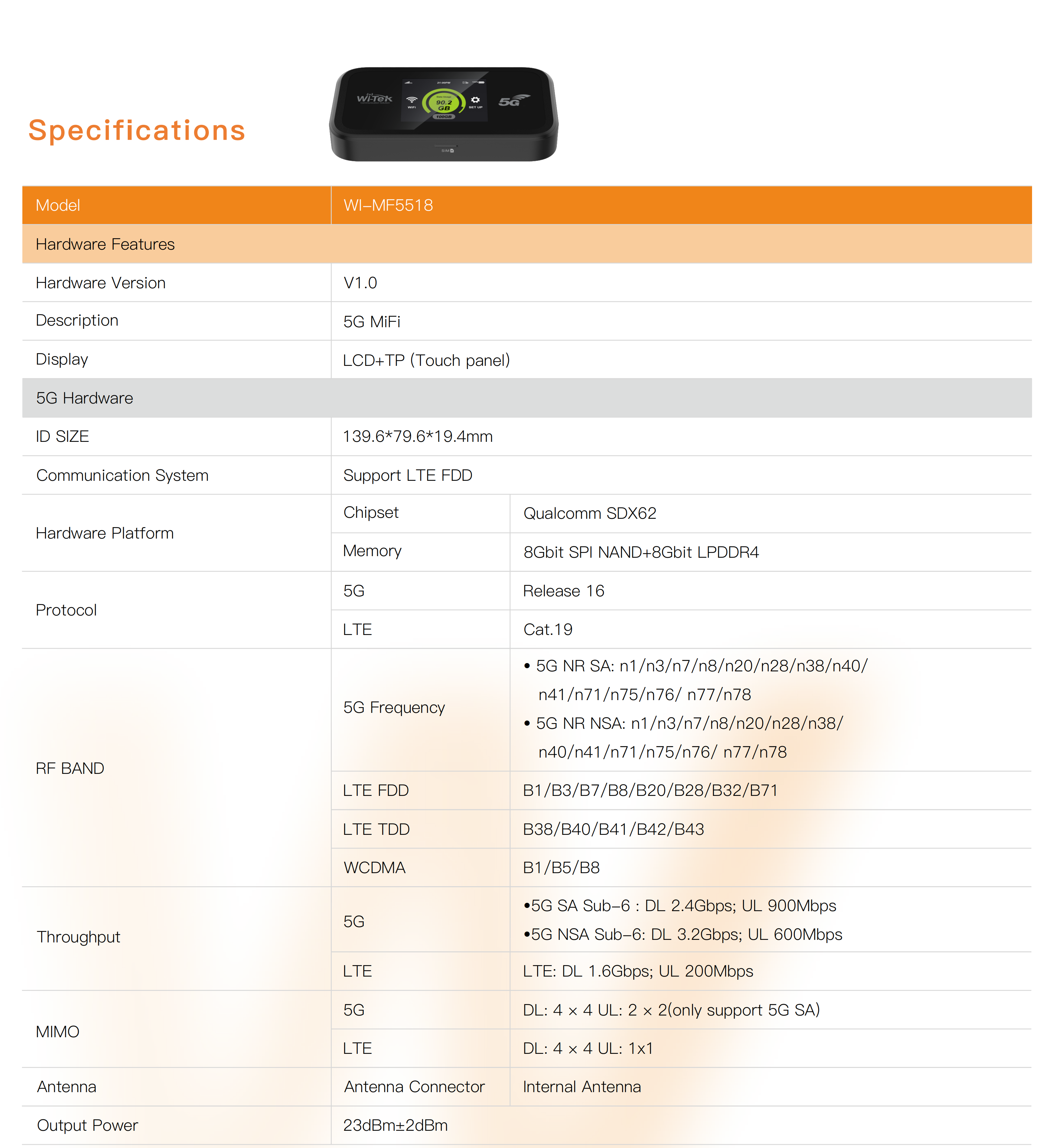 Home < Products < ISP Wi-Fi < 5G CPE/MiFi < WI-MF5518