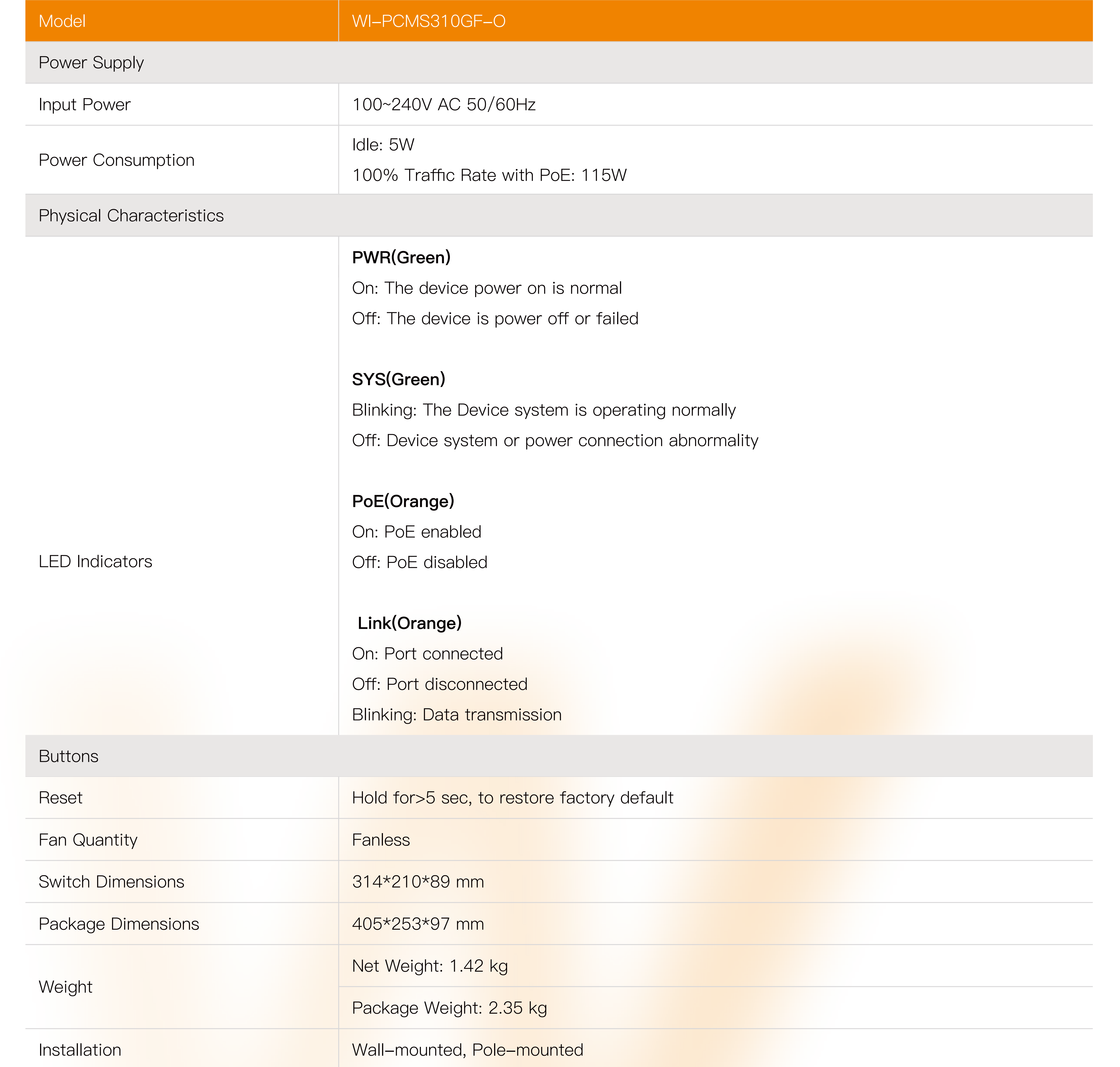 ● 8*10/100/1000Mbps RJ45 PoE Ports, 2*100/1000Mbps SFP Slots