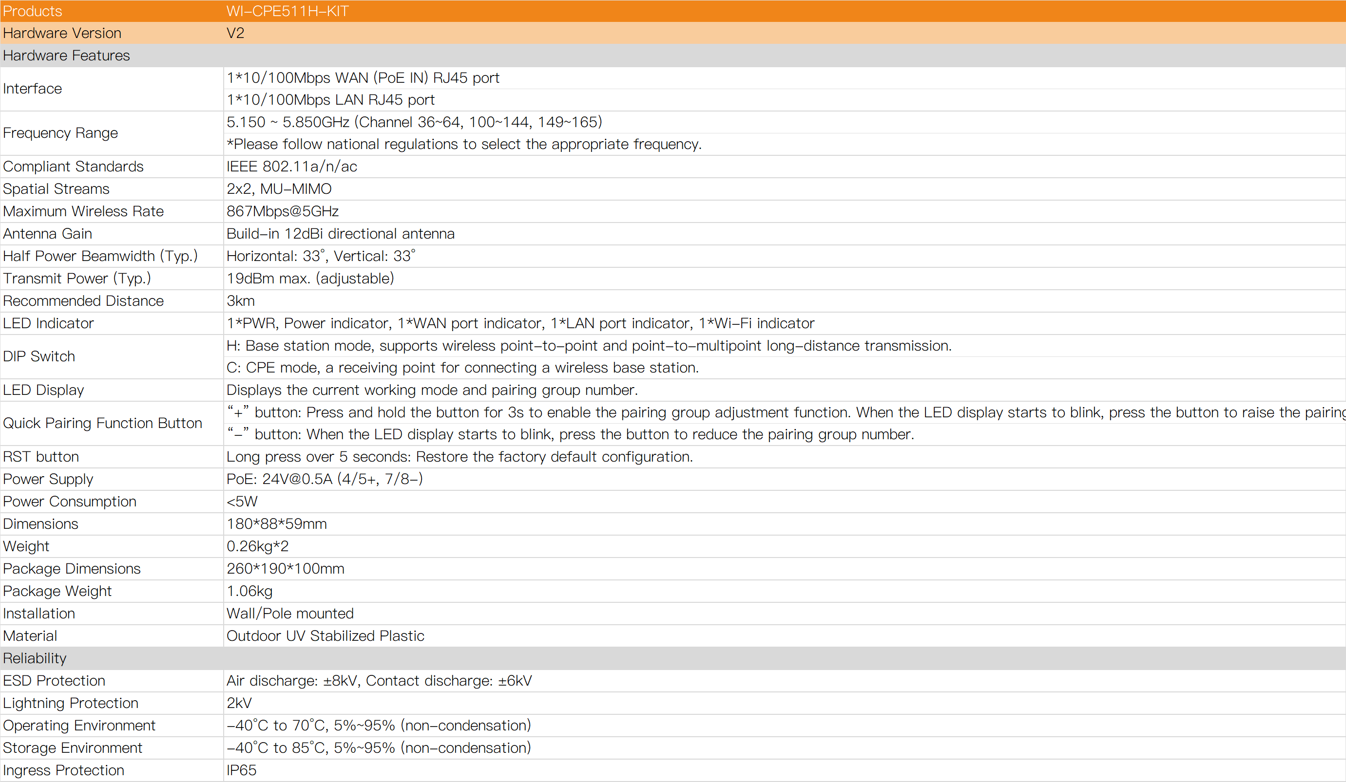 ● Built-in 12 dBi dual-polarized 33 degrees directional antenna
