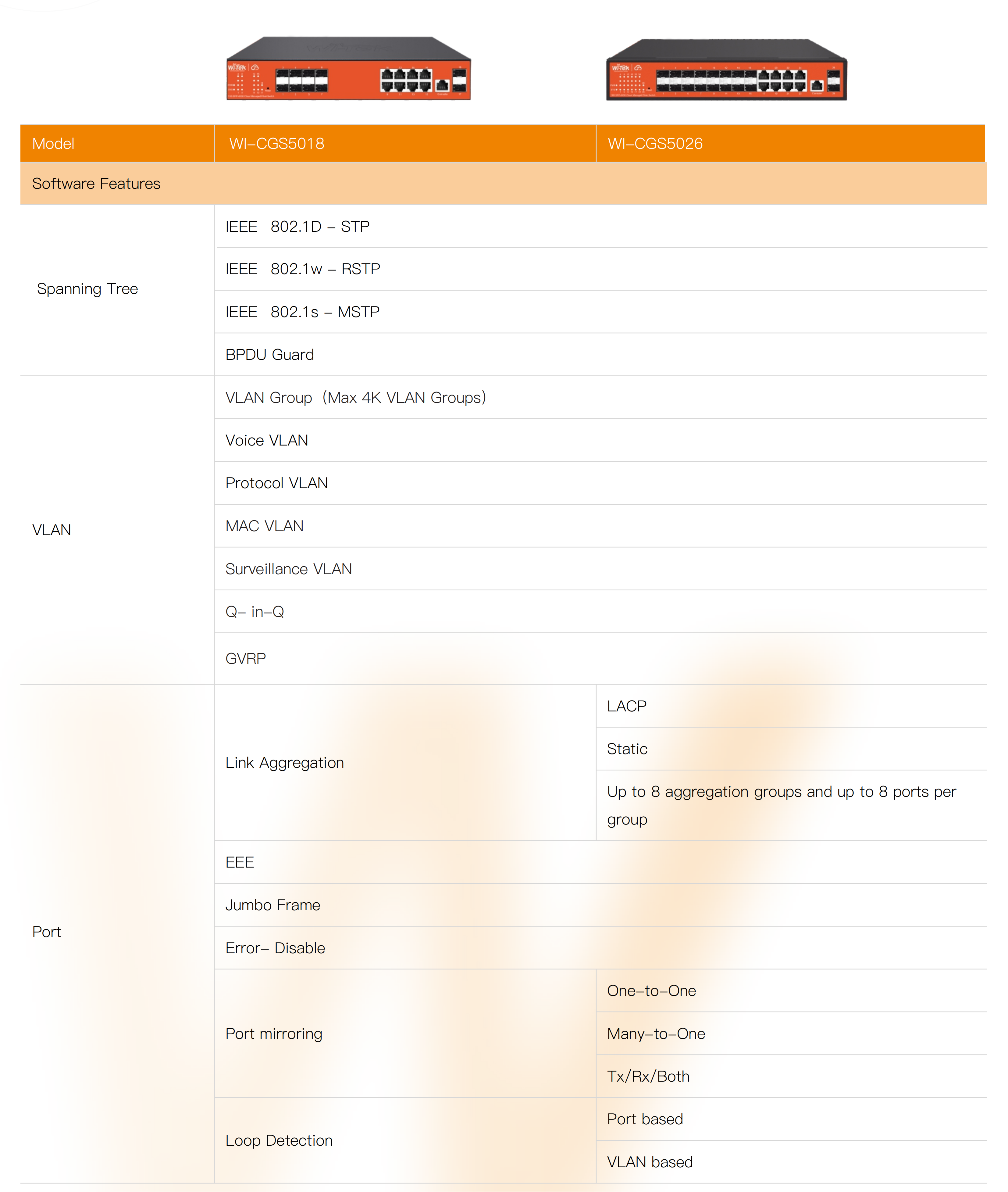 ● Support IGMP Snooping, Link Aggregation, Loop Prevention