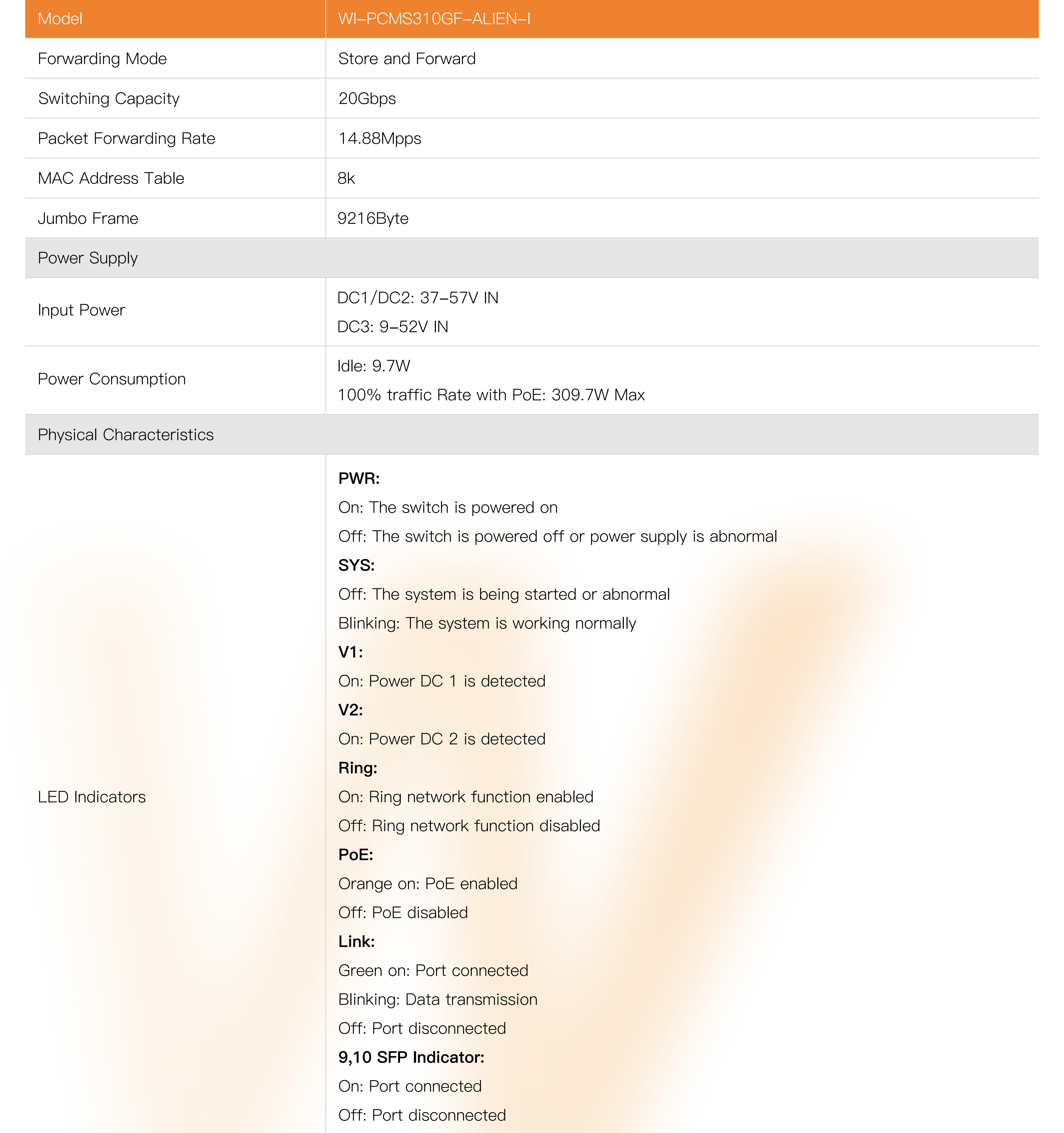 ● 8*10/100/1000Mbps RJ45 PoE Ports and 2*1000Mbps SFP Slots