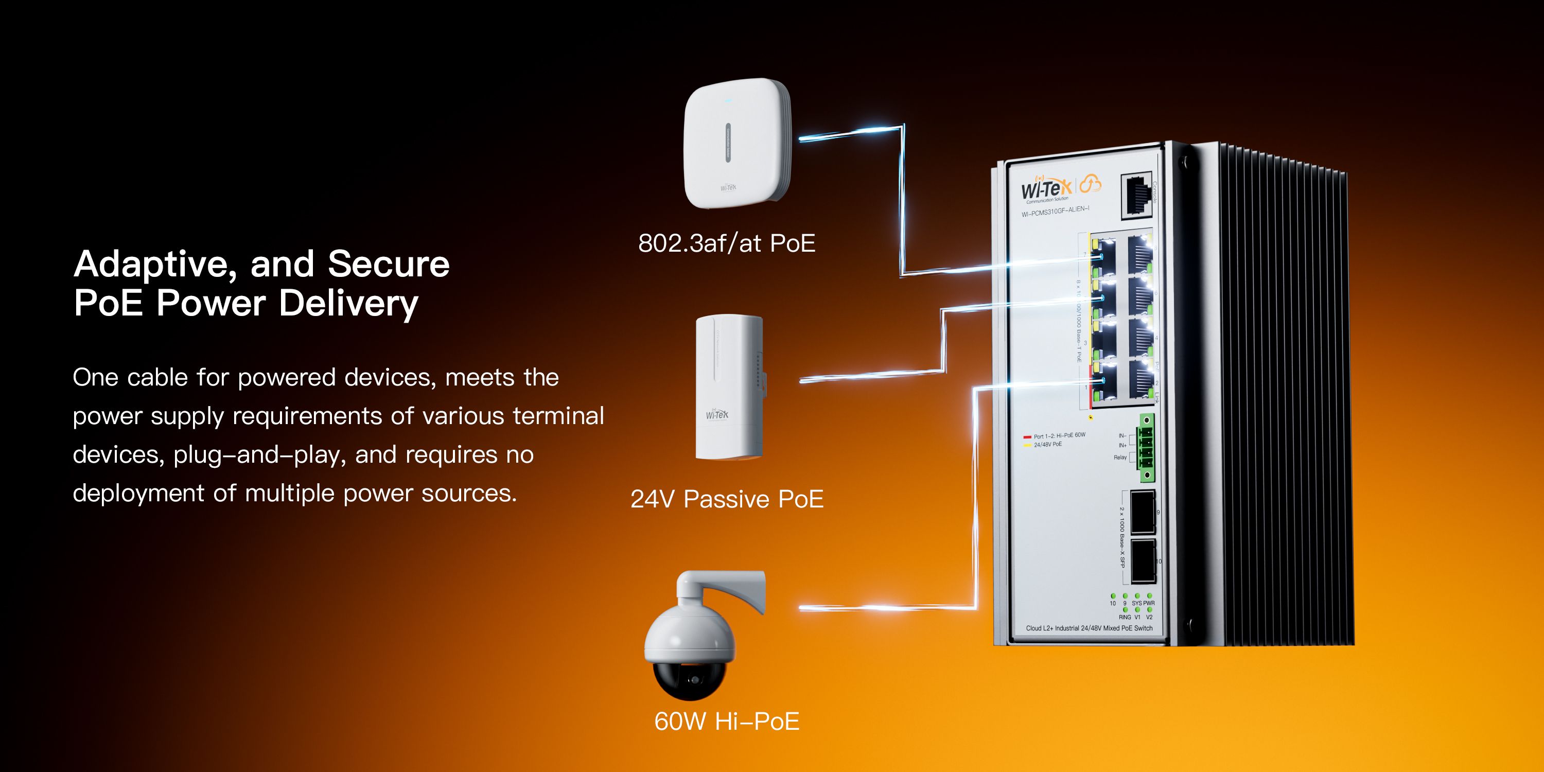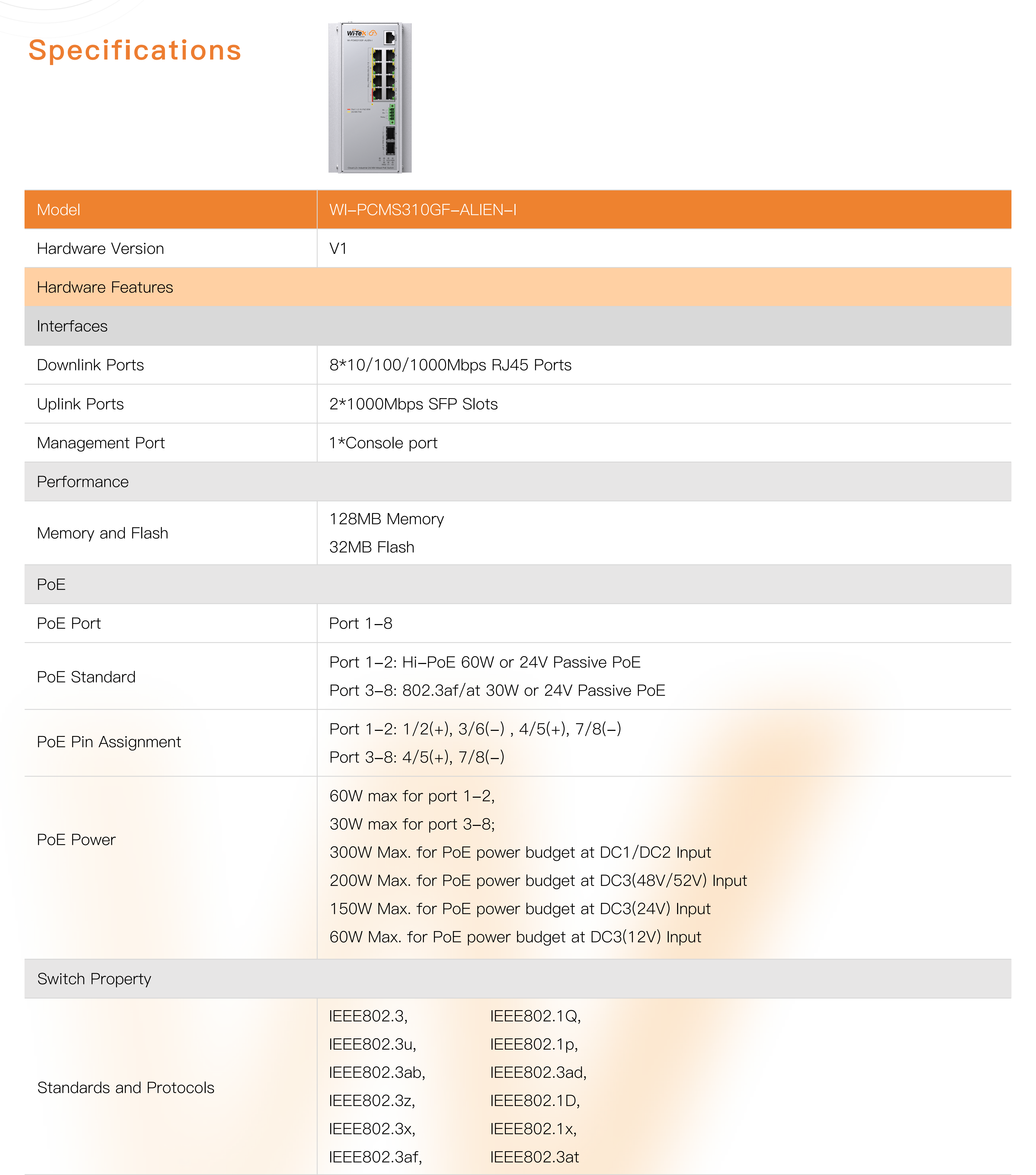 ● Ports 1-2 : Hi-PoE 60W or 24V Passive PoE; Ports 3-8 : 802.3af/at 30W or 24V Passive PoE