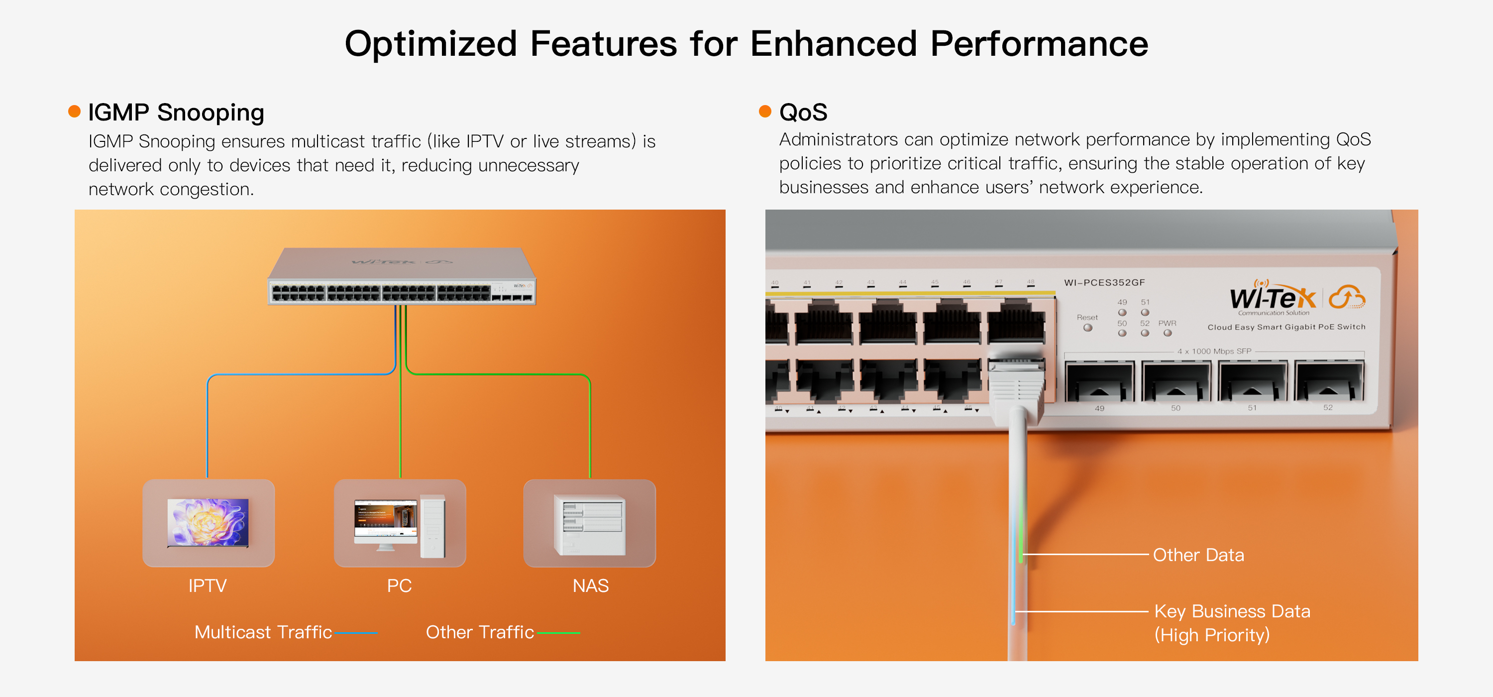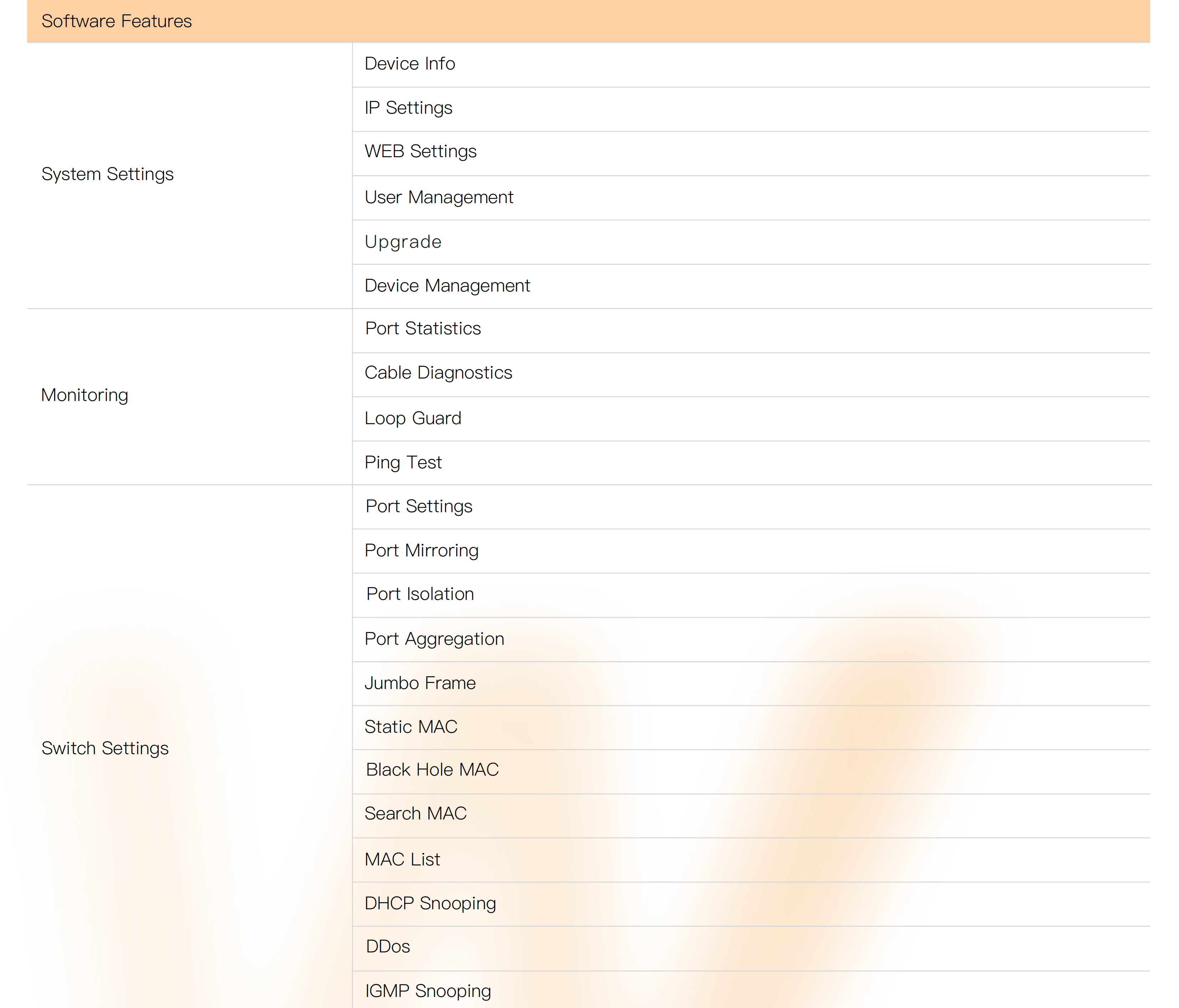 ● Support Voice VLAN to improve the quality of VolP communication, lGMP Snooping for effectively prevent L2 flooding of multicast flow and improve network performance