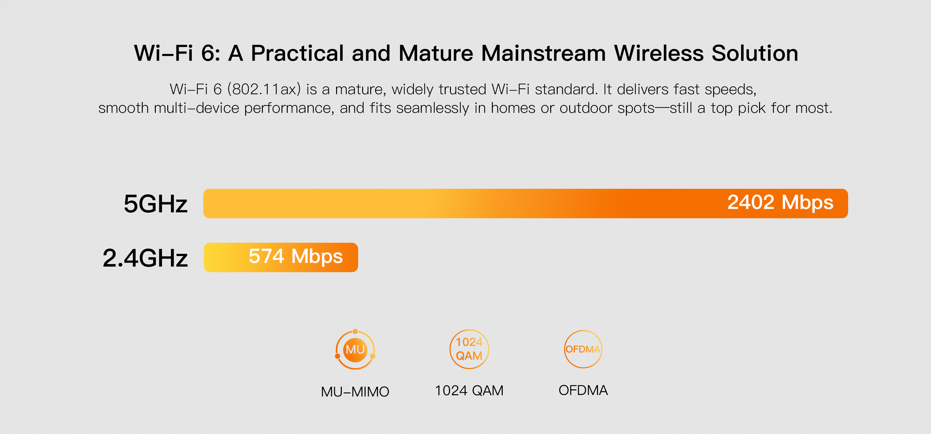 ● Wi-Fi 6 Dual-Band: 574Mbps at 2.4GHz + 2402Mbps at 5GHz