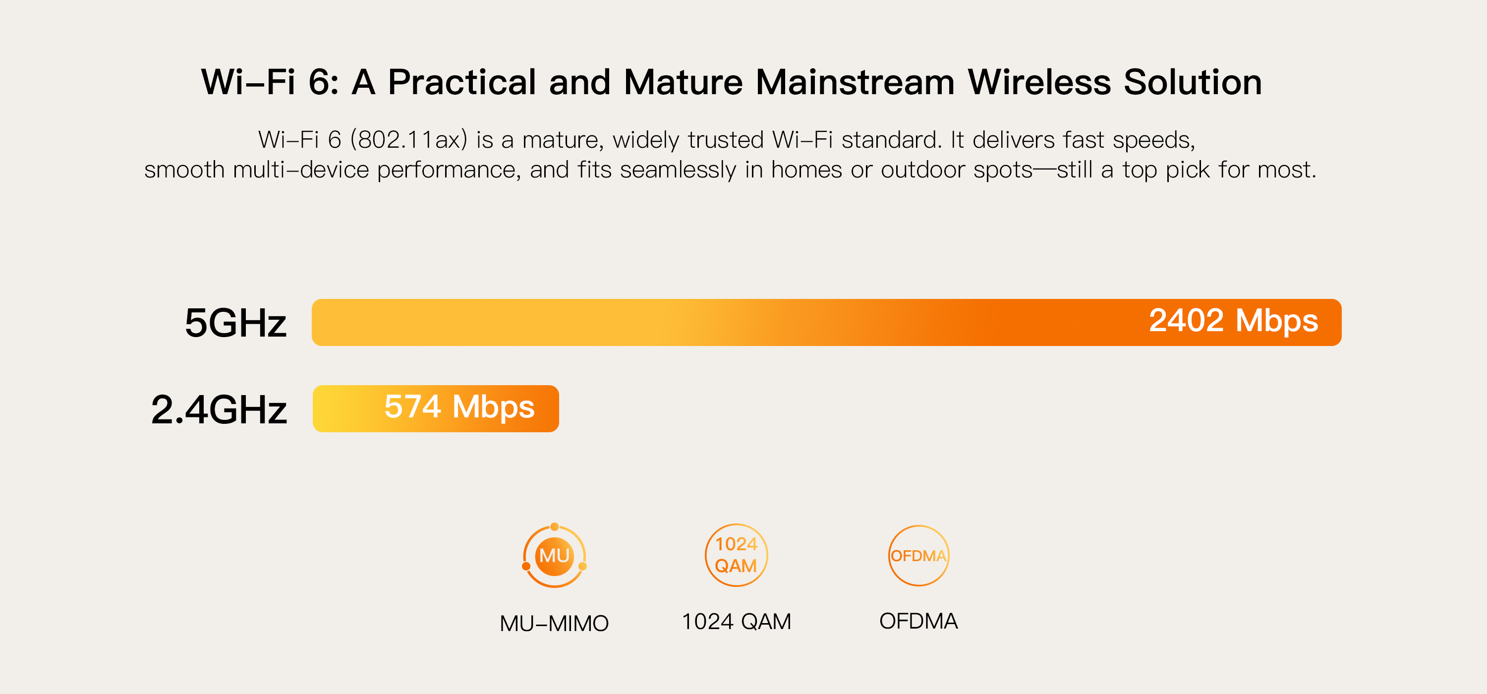 ● Wi-Fi 6 Dual-Band: 574Mbps on 2.4GHz and 2402Mbps on 5GHz.