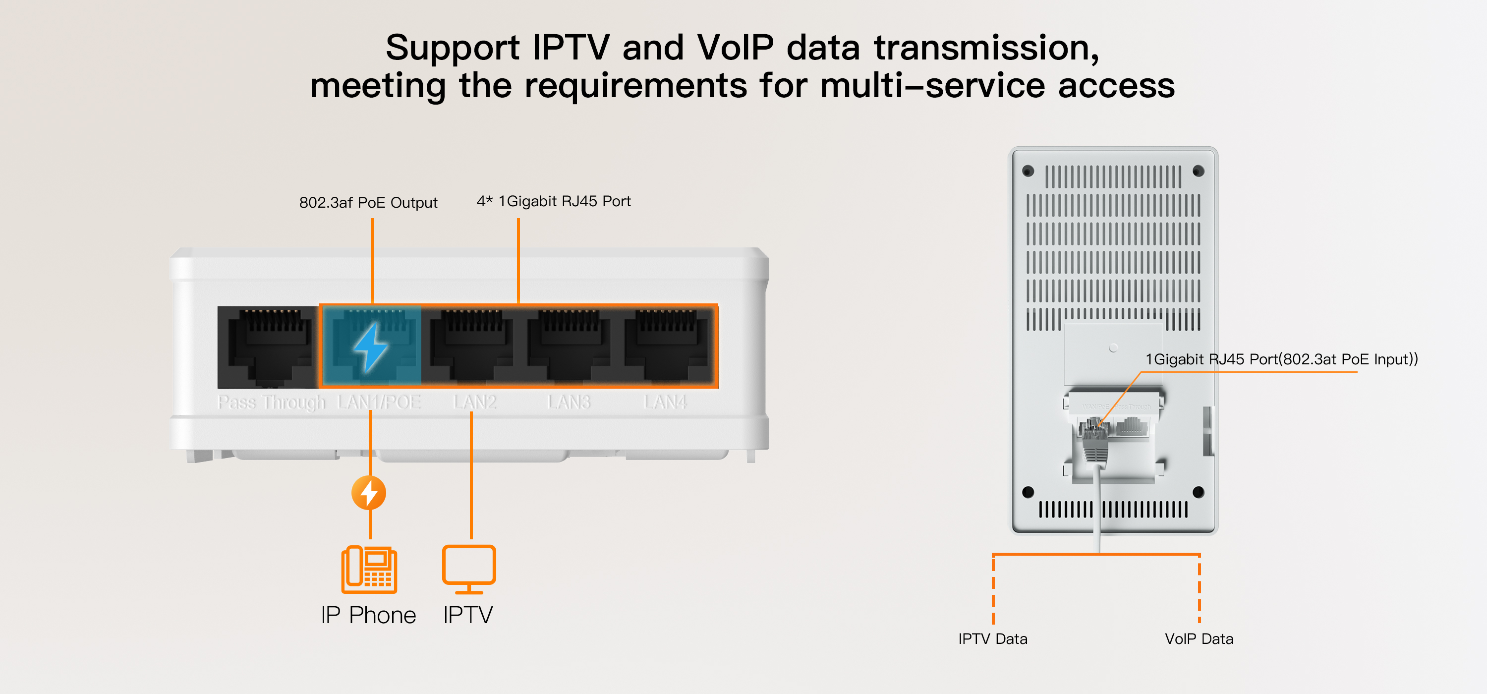 ● Support 802.3at PoE Input at WAN port and 802.3af PoE Output at LAN1 port.