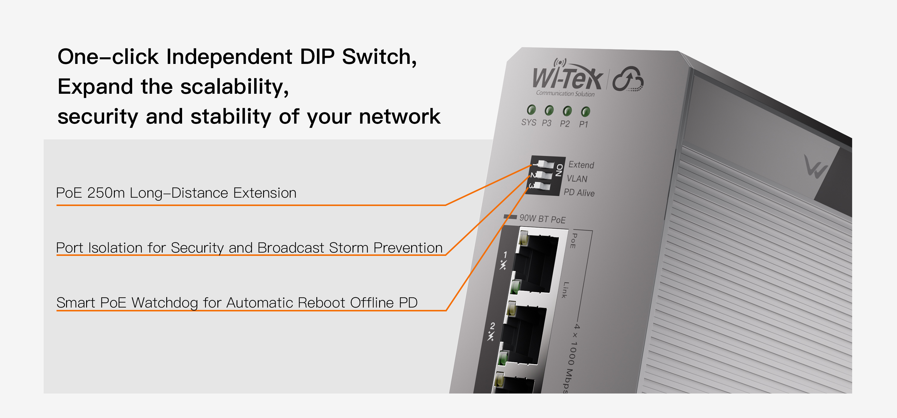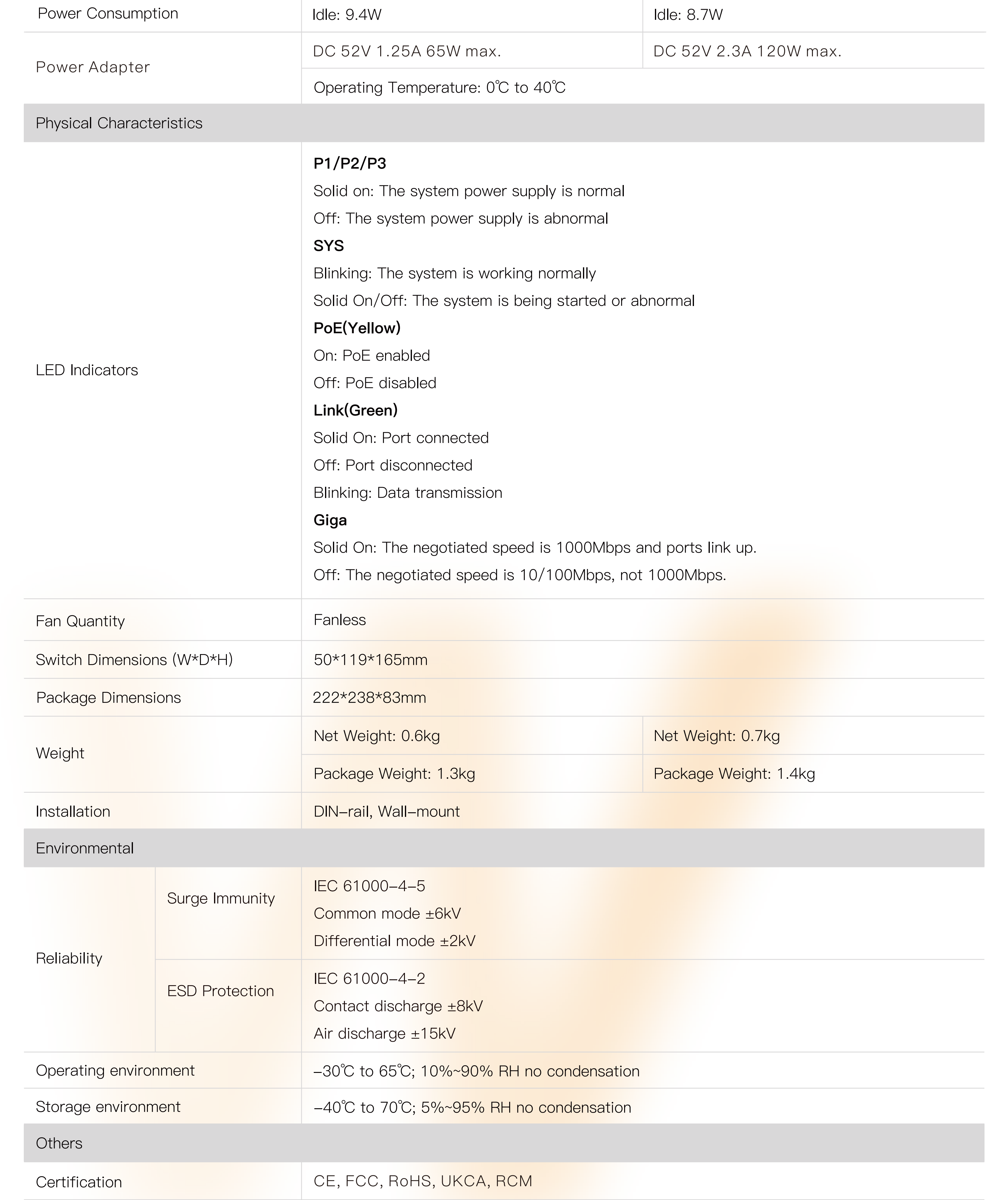 ● 4*10/100/1000Mbps PoE++ ports, 1*10/100/1000Mbps RJ45 Uplink port and 1*1000Mbps SFP slot