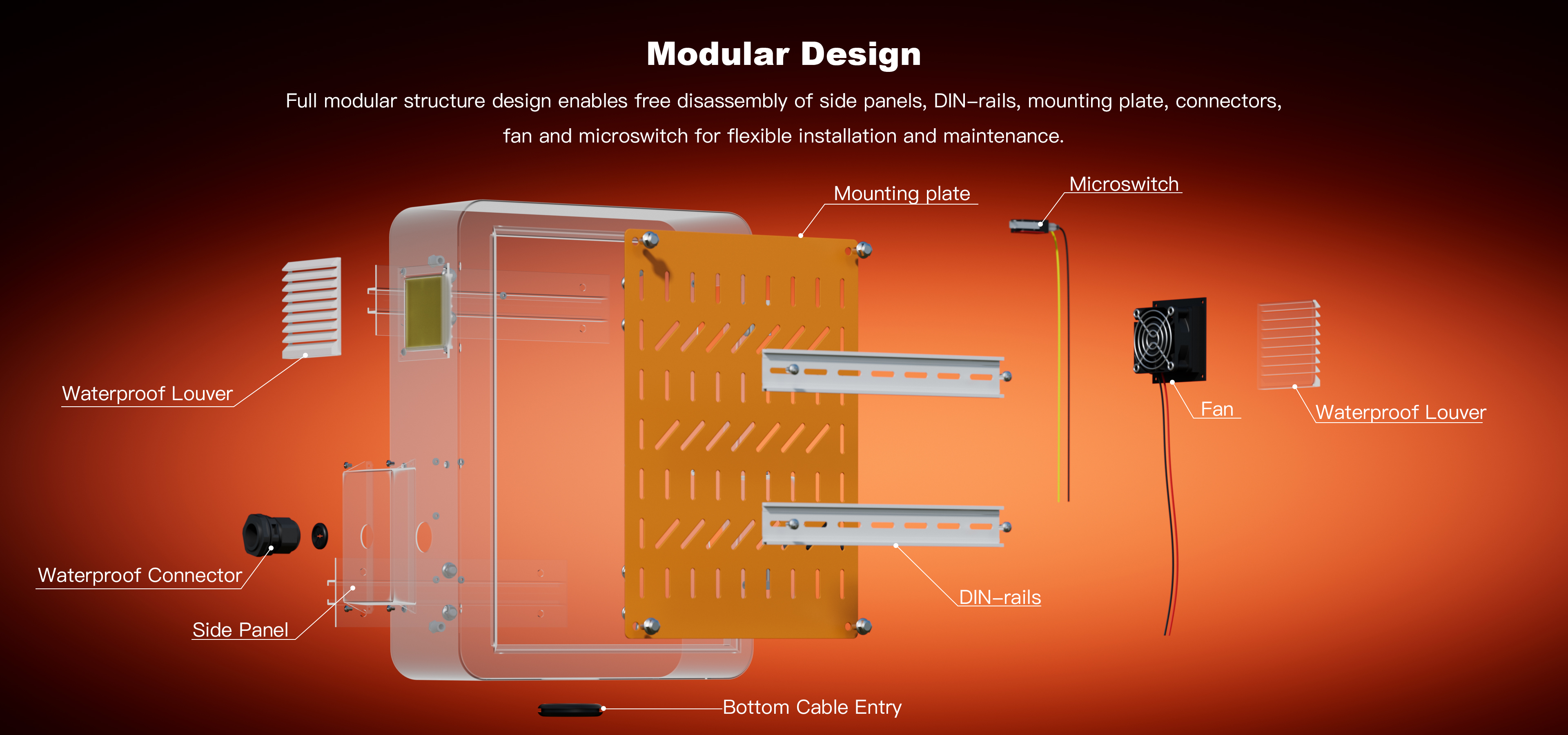 The modular structure design, side panel, DIN-rail, mounting plate, waterproof connector, fan, and