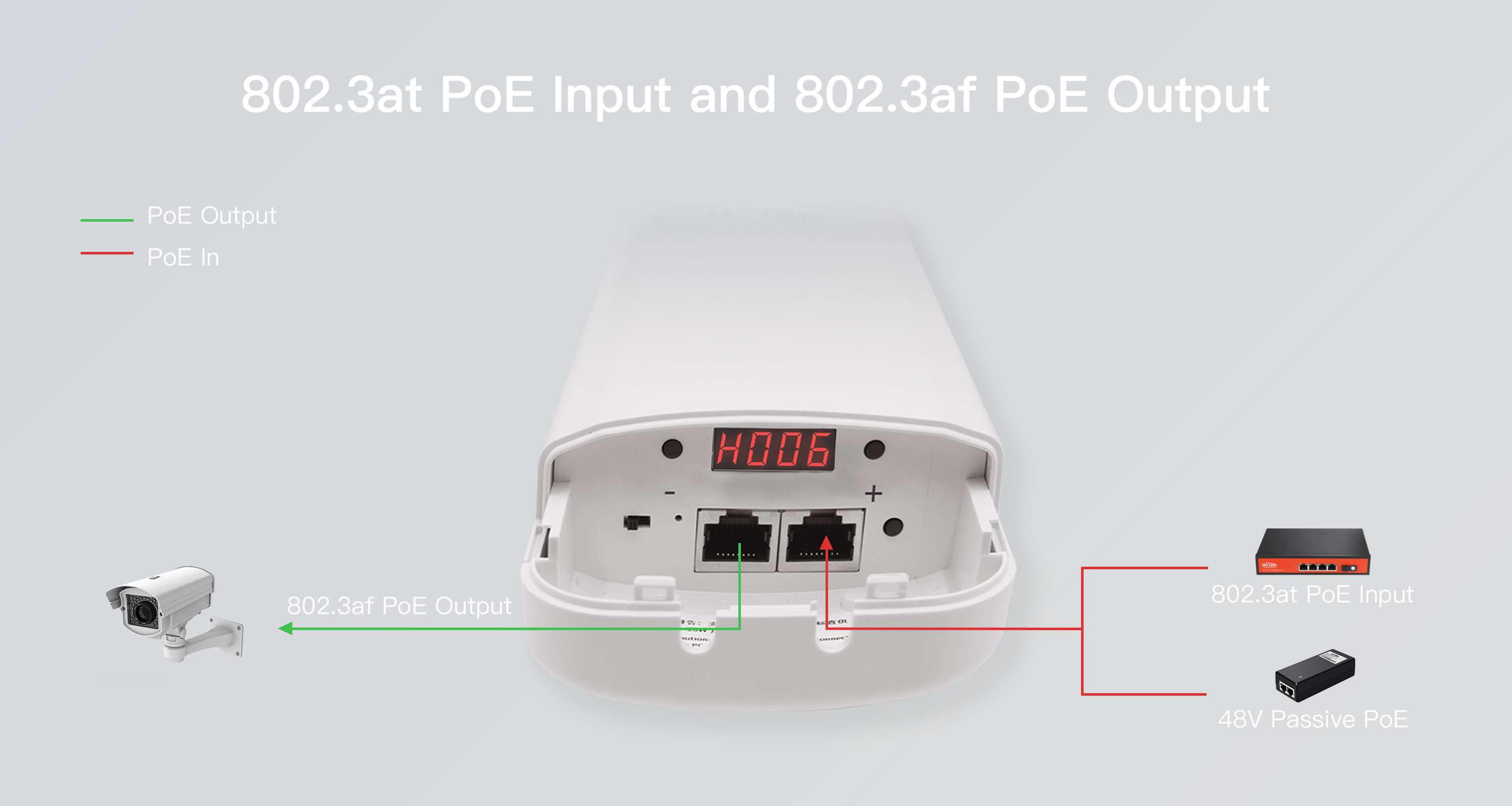 ● Support IEEE802.3at PoE input and IEEE 802.3af PoE Output