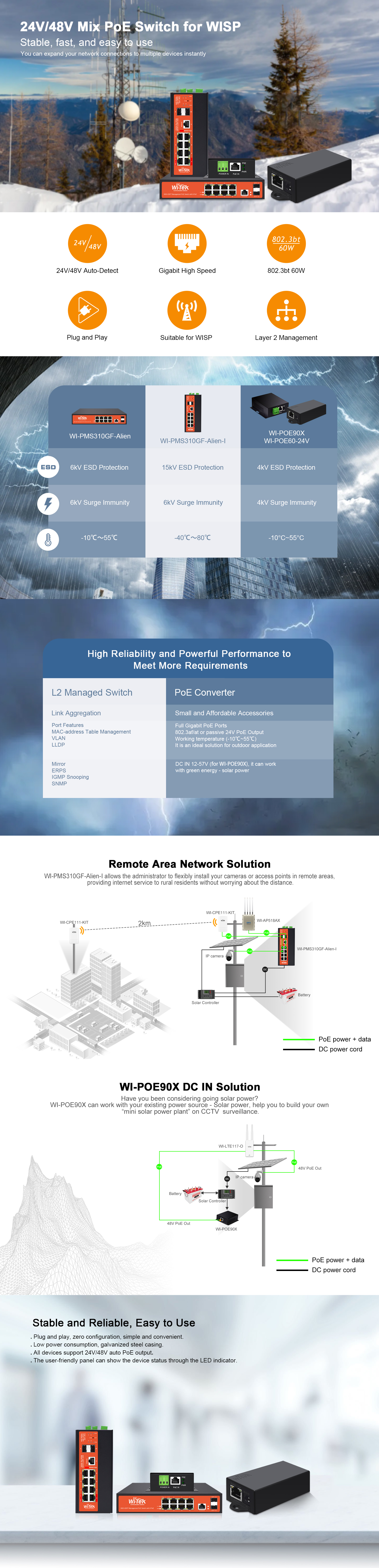 ● Auto detect 48V 802.3af/at or 24v passive PoE