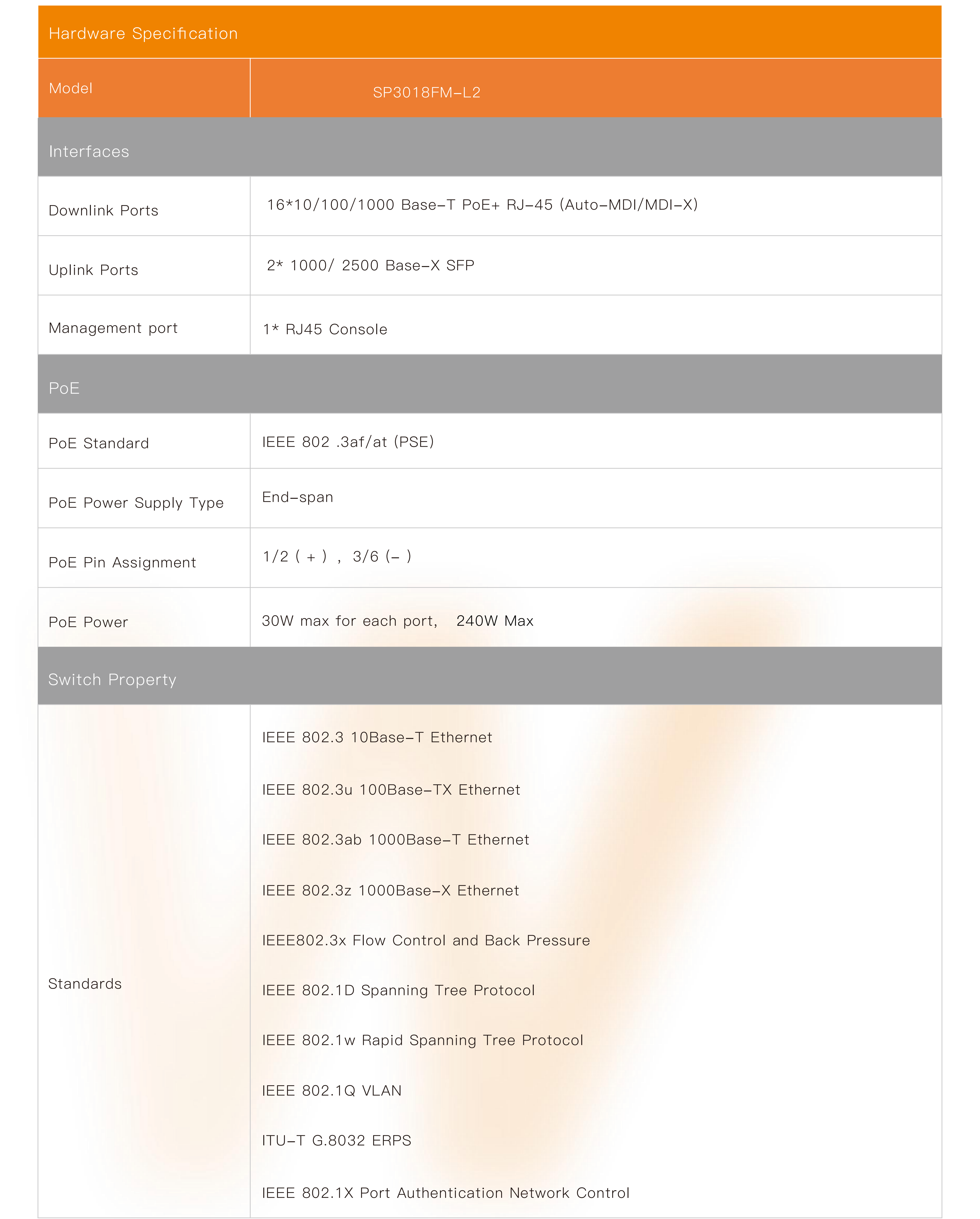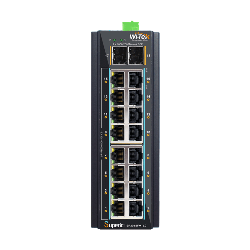 ● 16*10/100/1000 Base-T PoE+ RJ-45 ports and 2*1000/2500 Base-X SFP slot
