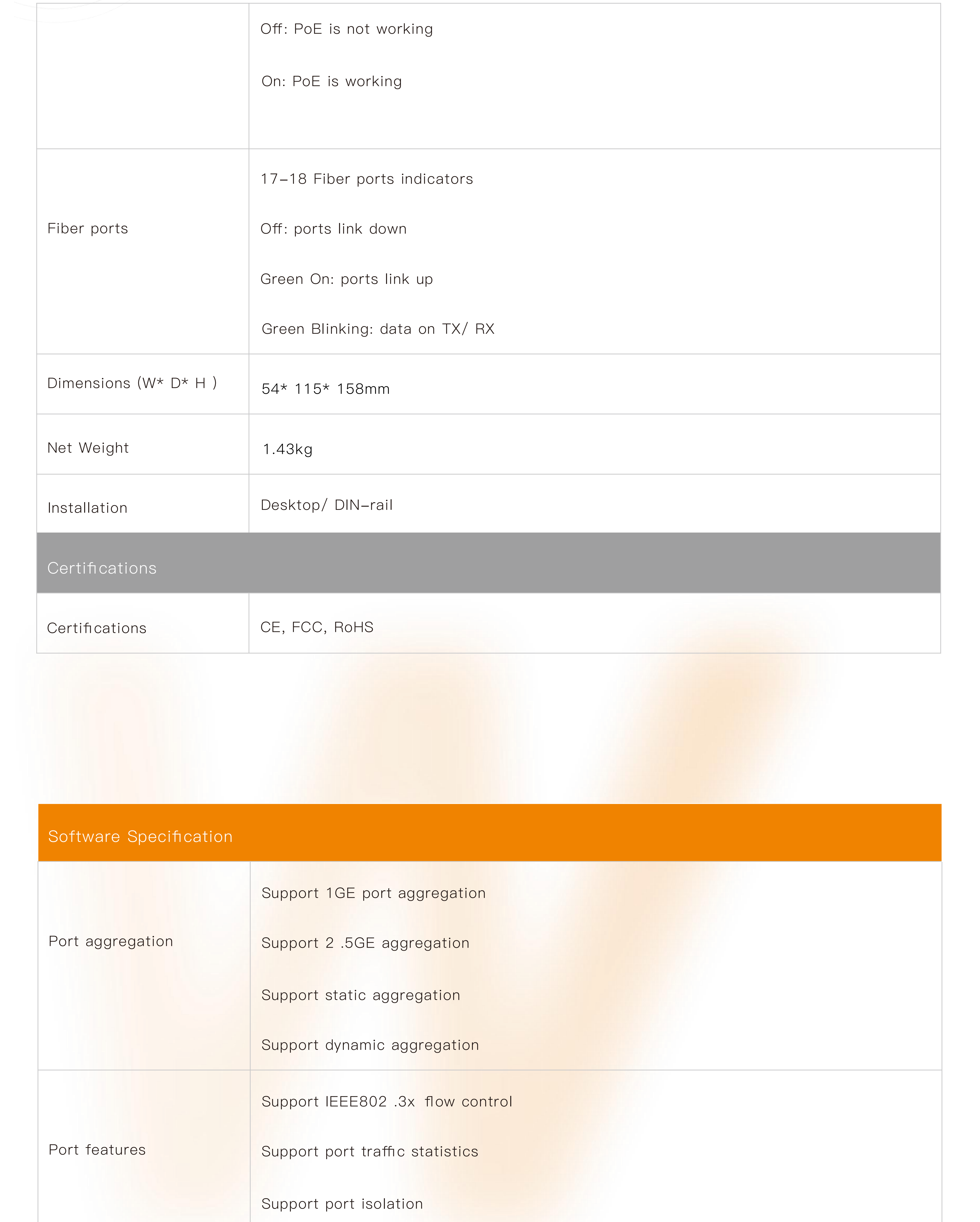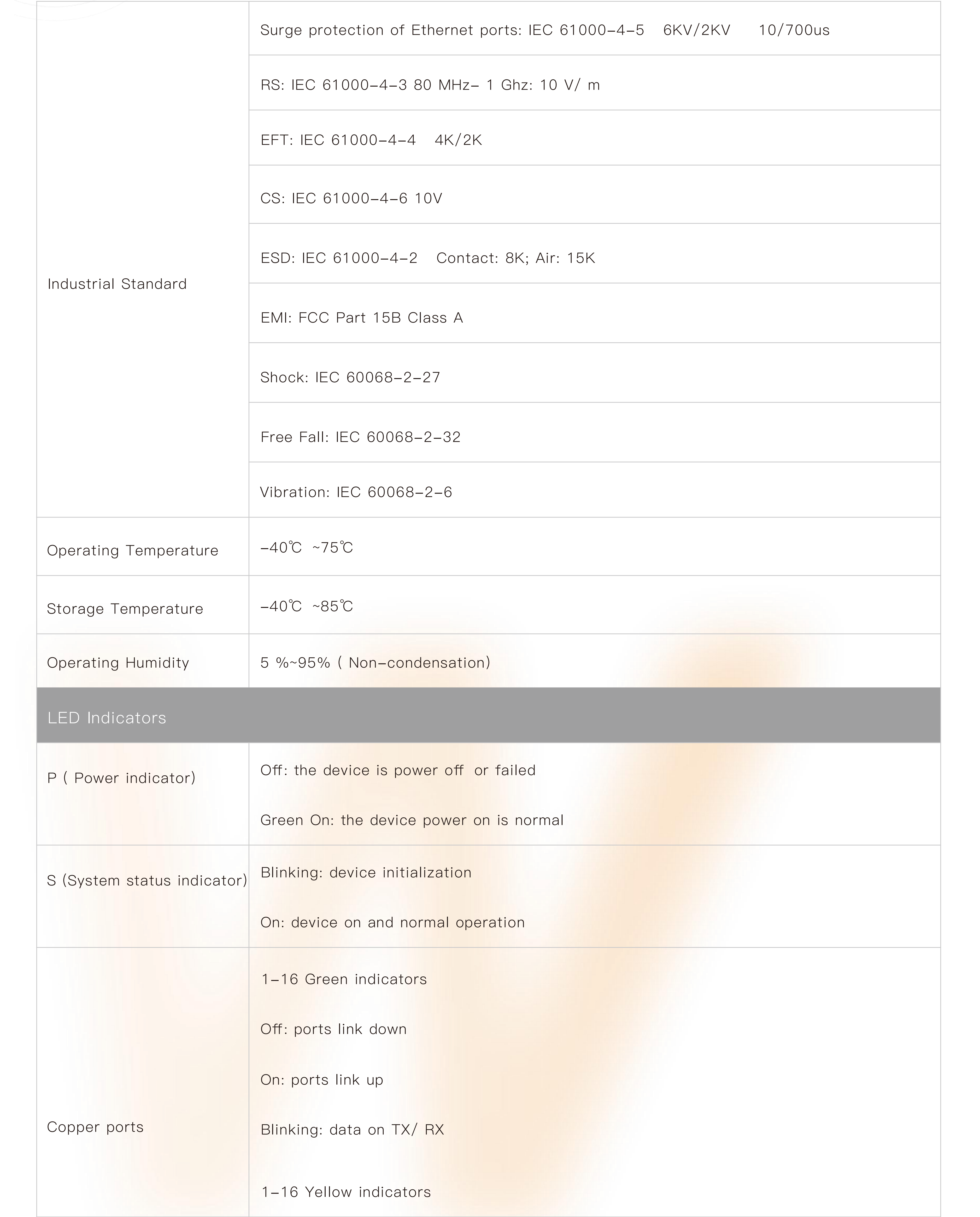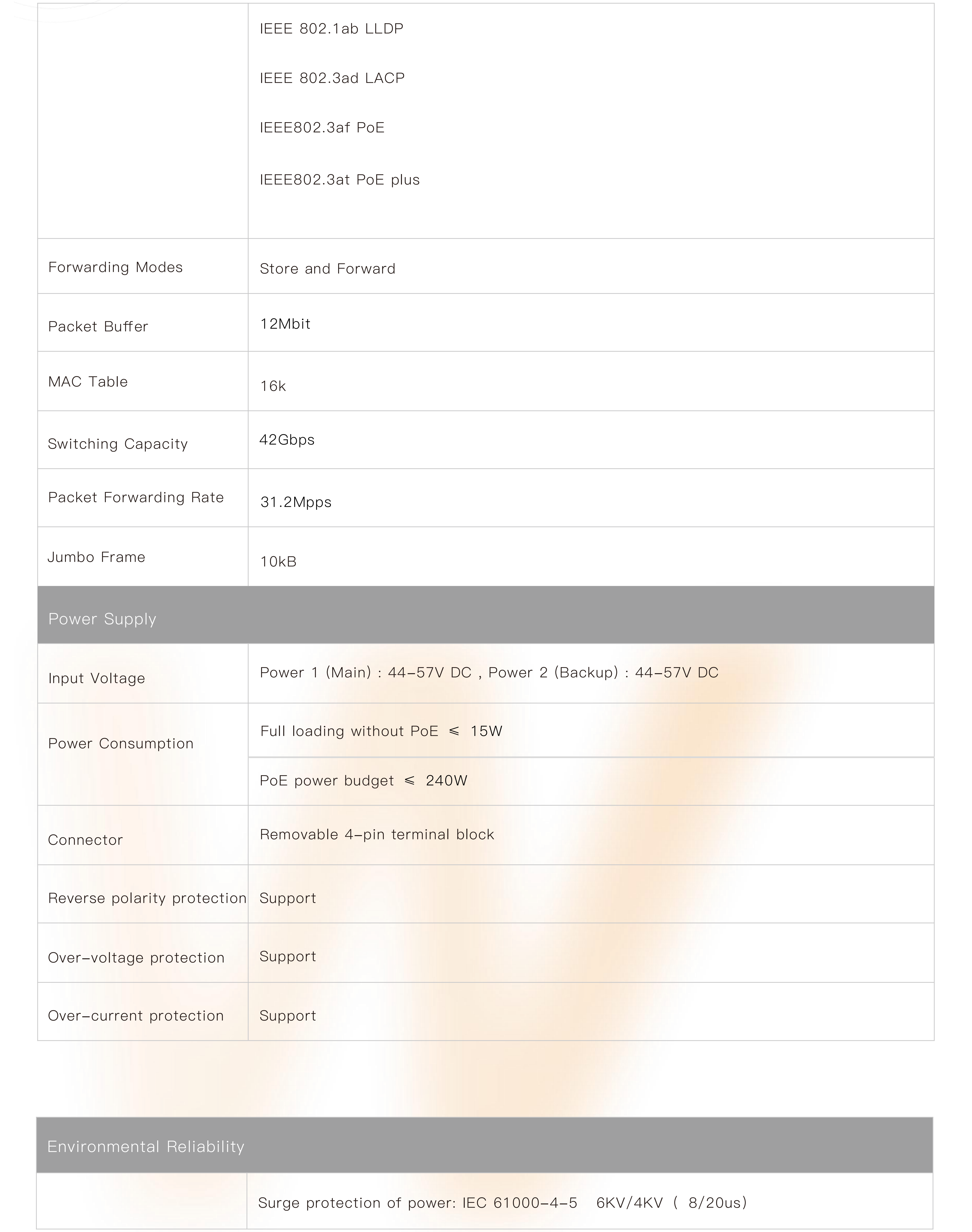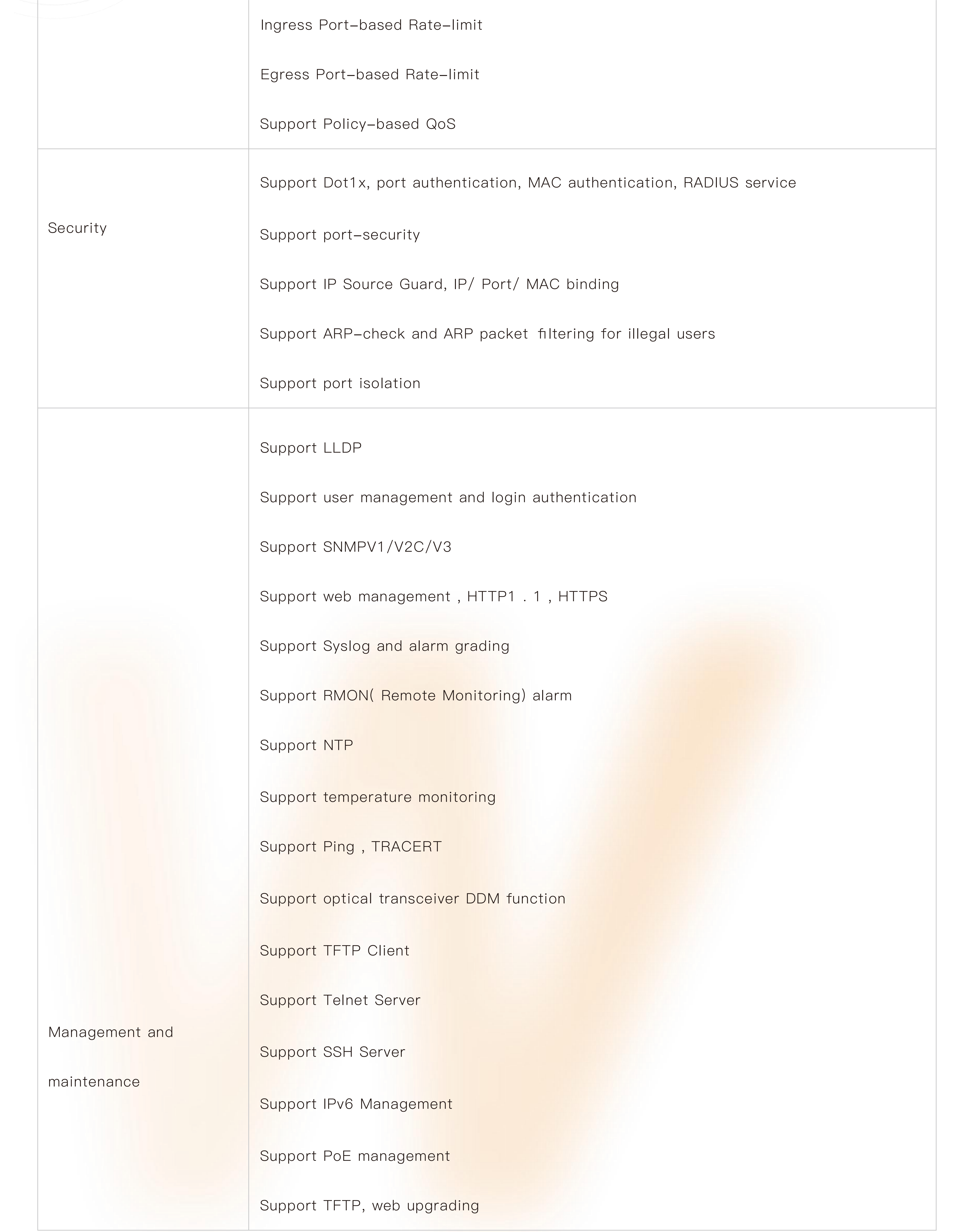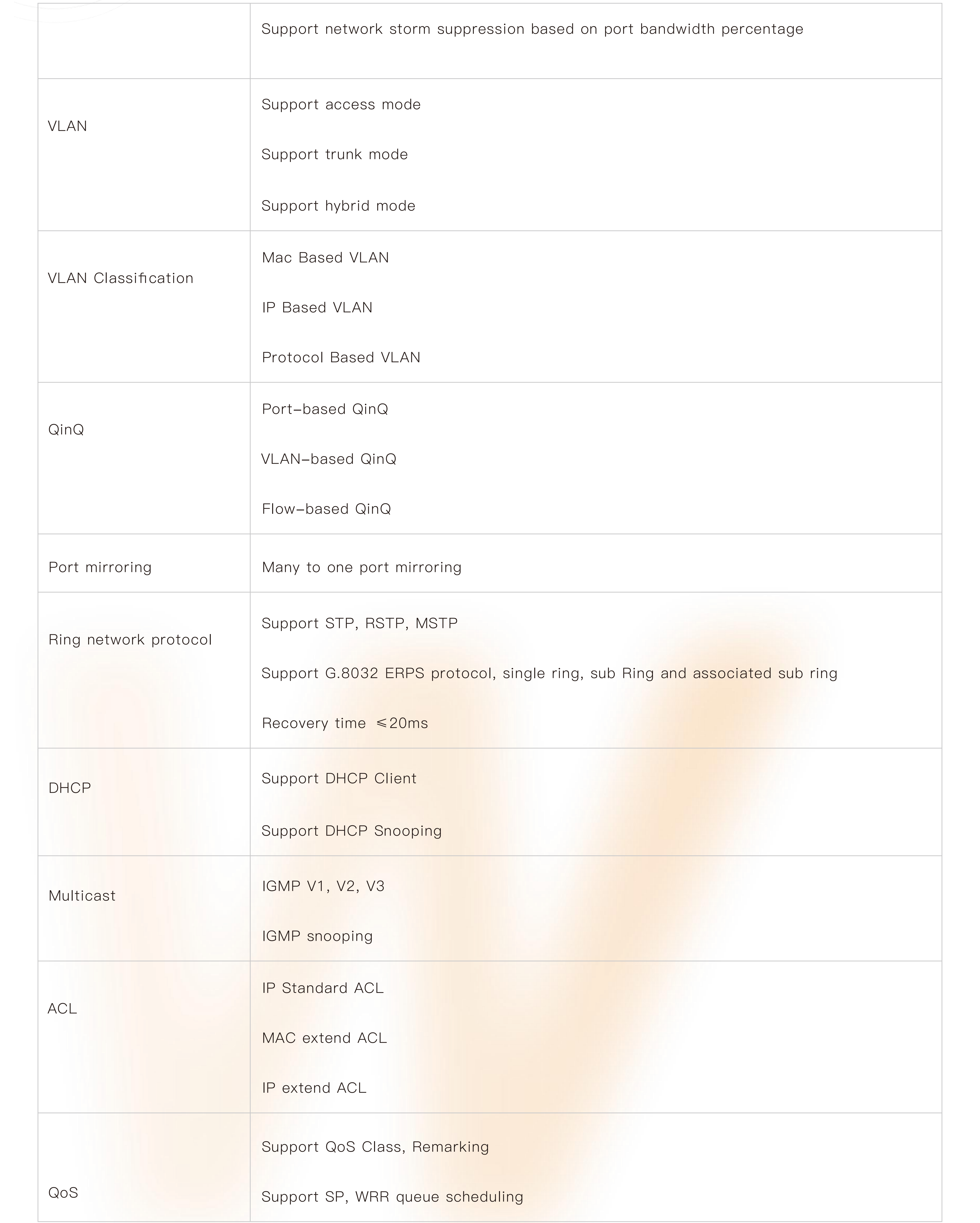 ● Support robust L2 managed function, such as VLAN, VLAN classification, QinQ, port mirroring, STP, RSTP, MSTP, IGMP, QoS, DHCP, multicast, ACL, dying gasp,LLDP, 802.1X, fiber transceiver DDM, PoE management, G.8032 ERPS protocol, IPV6 management