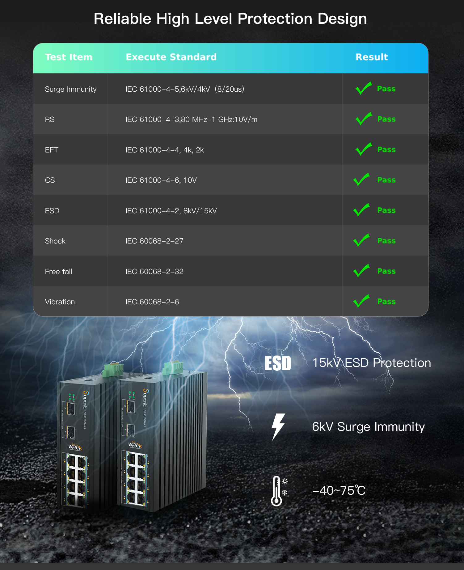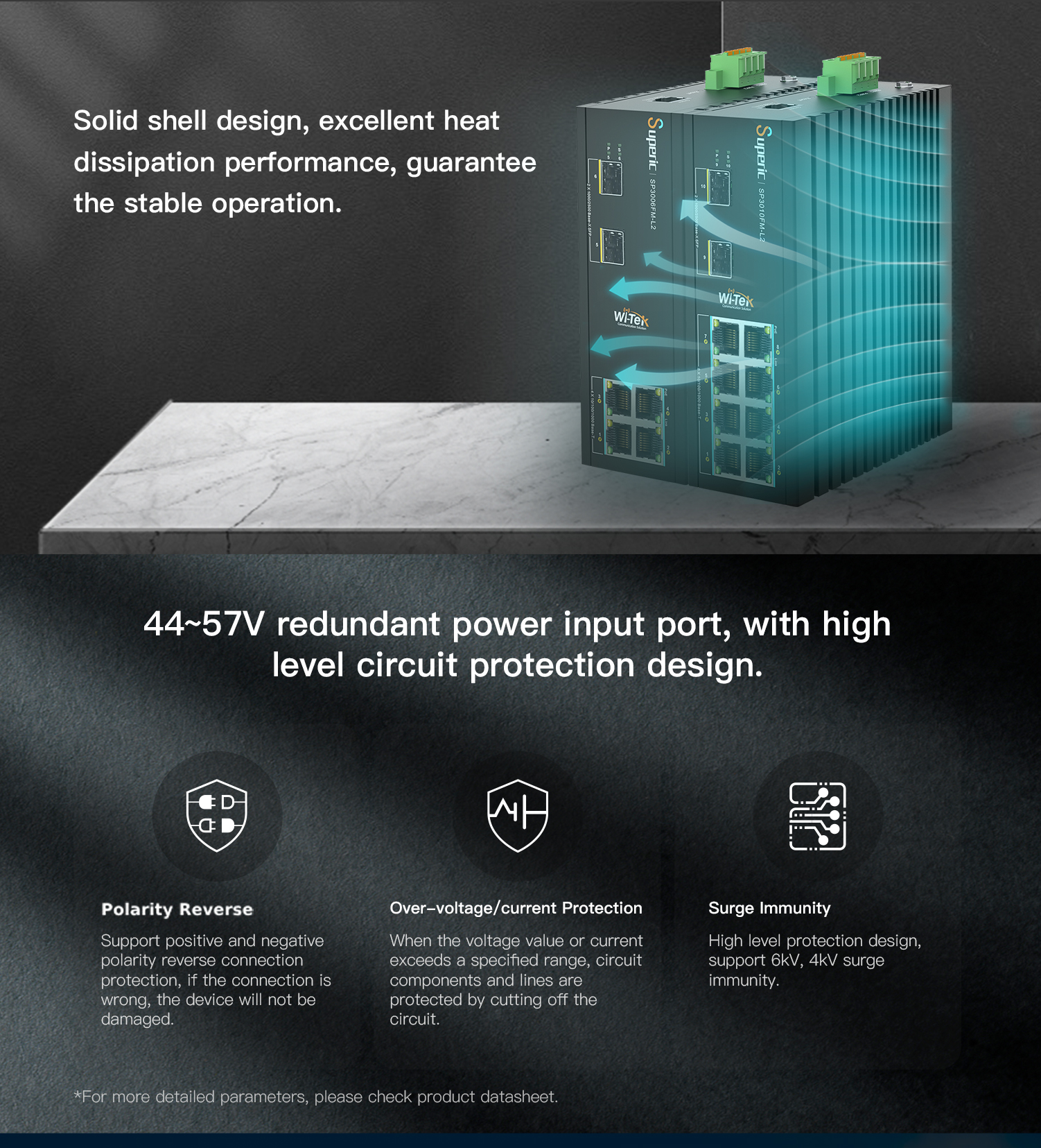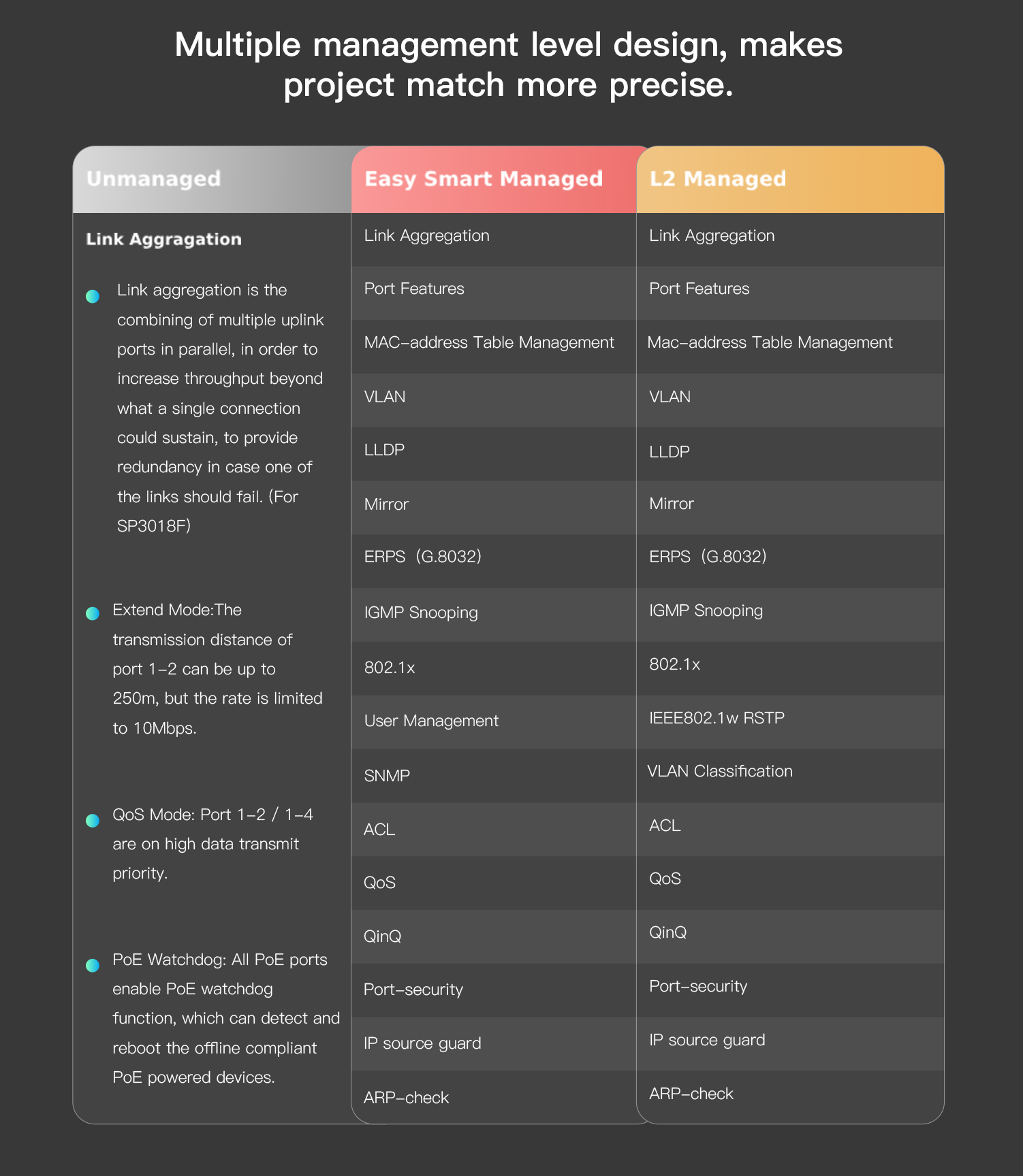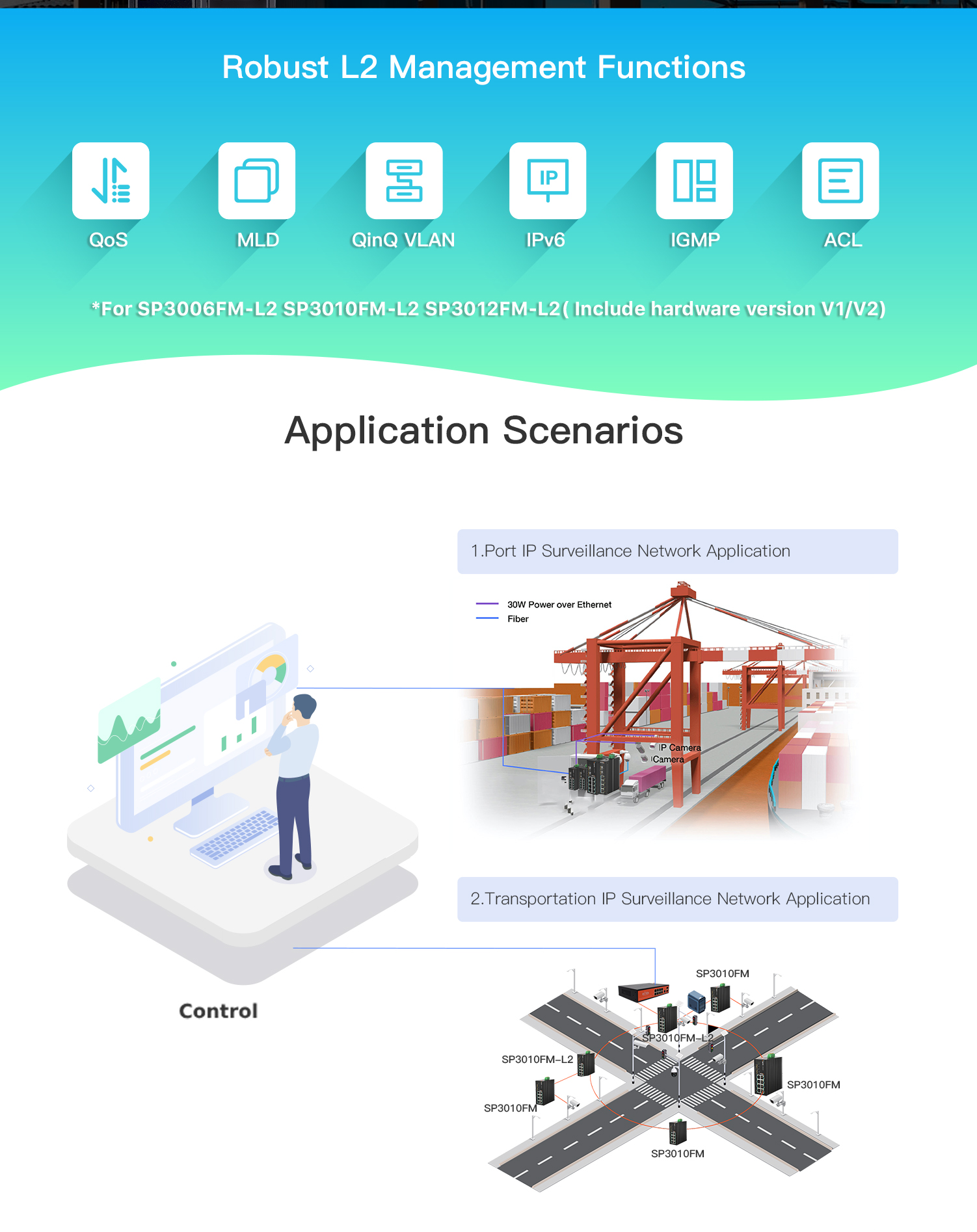 ● Support robust L2 managed function, such as VLAN, classification, QinQ, port mirroring, STP, RSTP, MSTP, IGMP, QoS, DHCP, multicast, ACL, dying gasp,LLDP, 802.1X, fiber transceiver DDM, PoE management, G.8032 ERPS protocol, IPV6 management