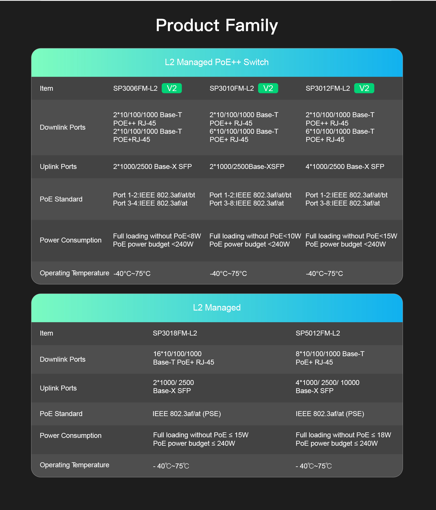 ● 2*10/100/1000 Base-T PoE++ RJ-45 ports,6*10/100/1000 Base-T PoE+ RJ-45 ports and 4*1000/2500 Base-X SFP slots