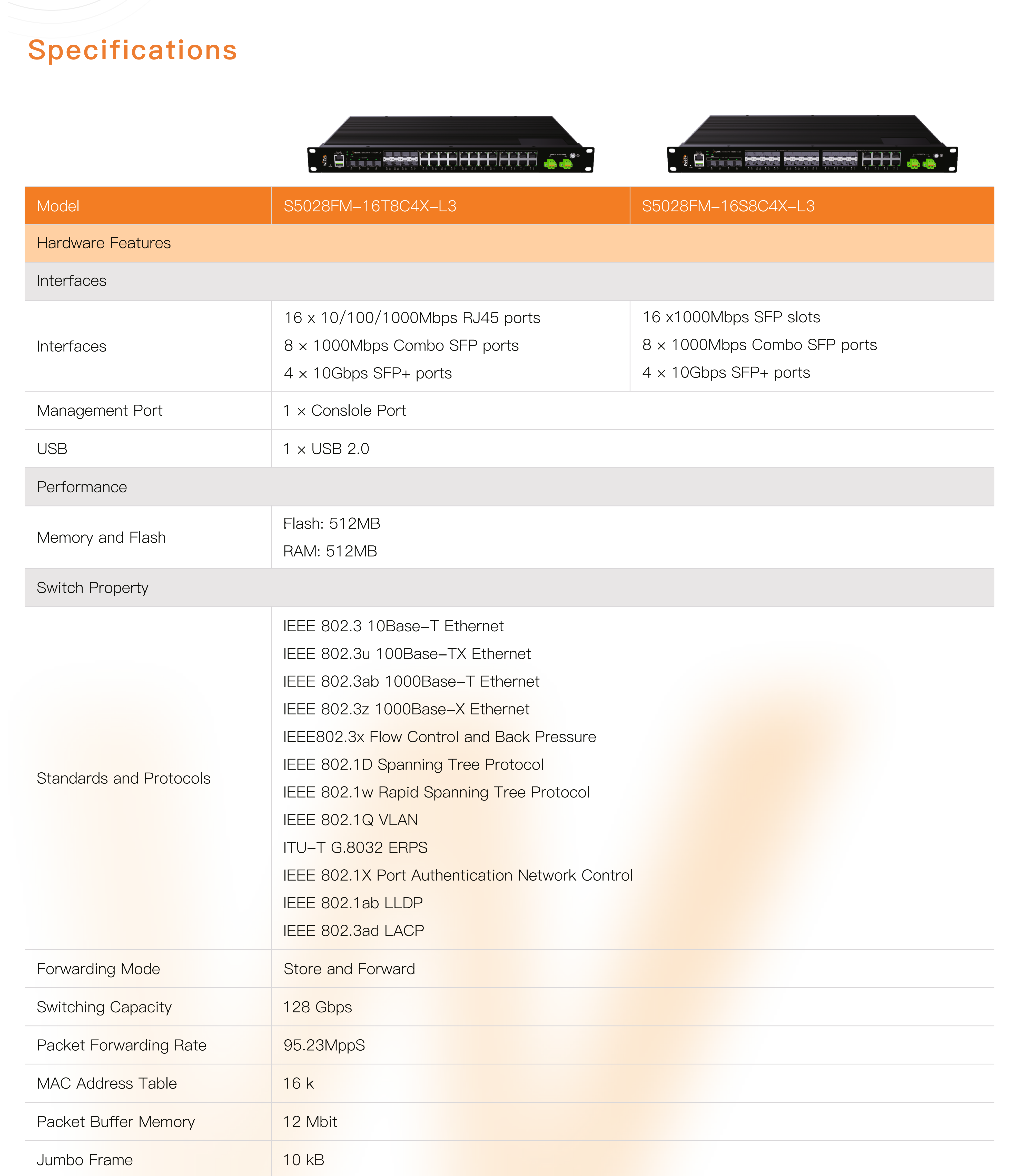 ● 16*100/1000Base-T RJ-45 ports , 8*1000Mbps Combo, 4*1G/2.5G/10GGBase-X SFP+
