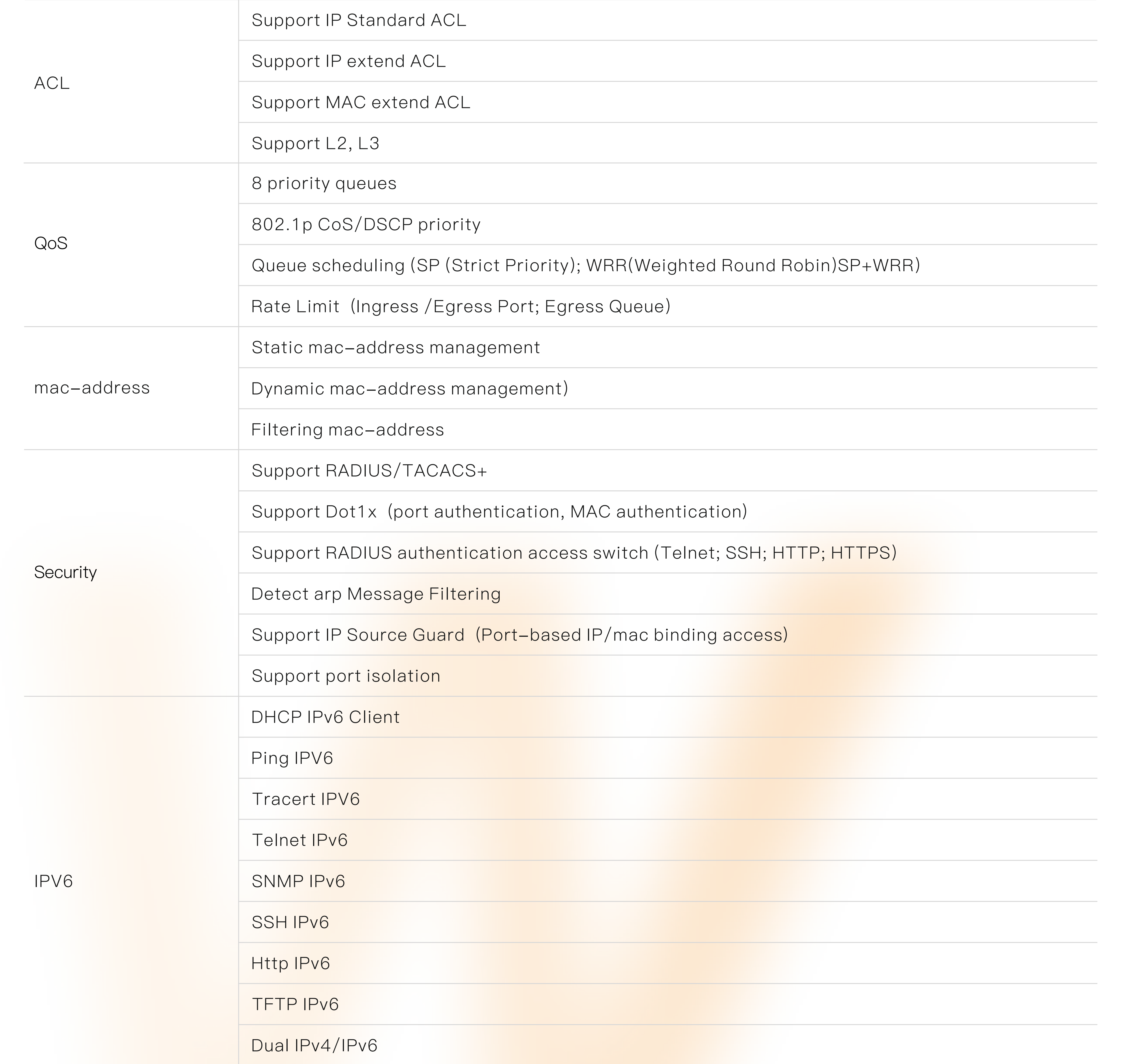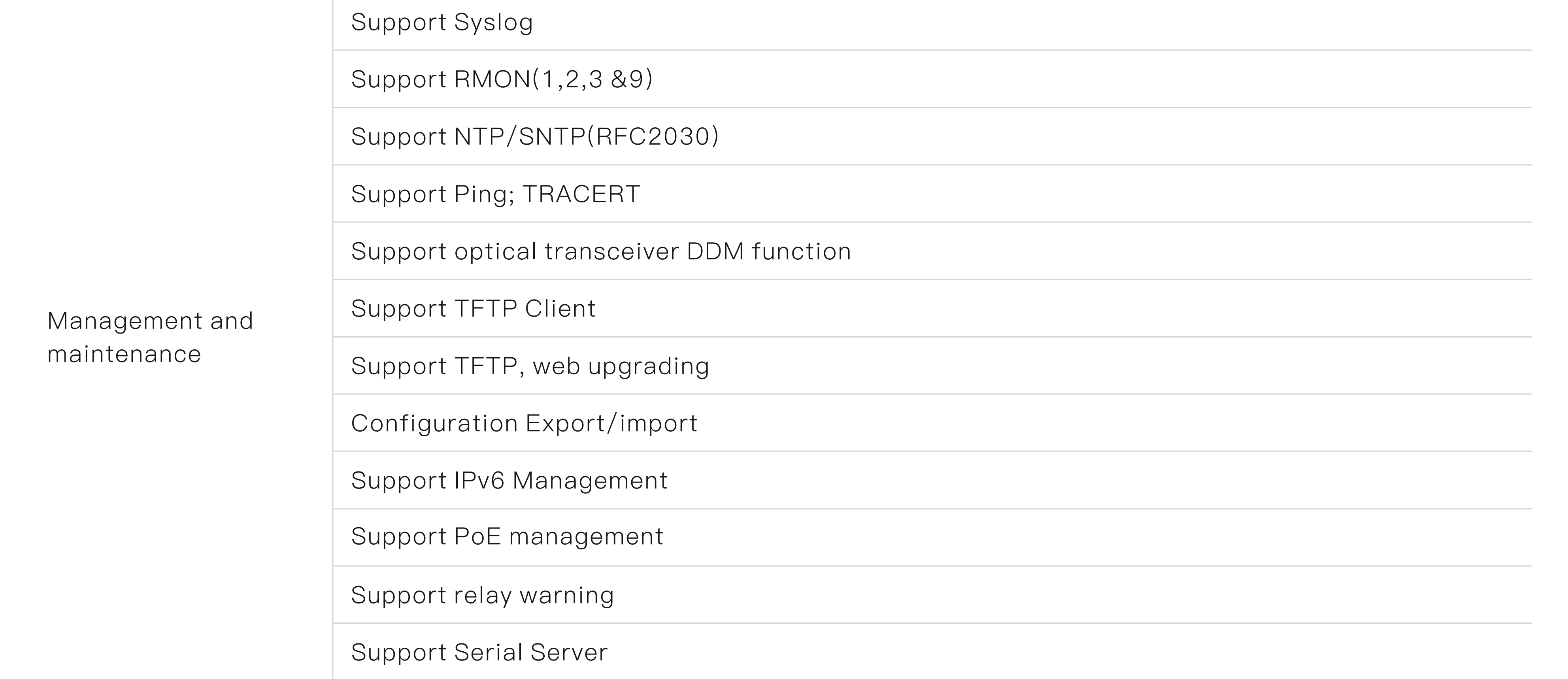 ● Support robust L2 managed function, such as 802.1Q VLAN, VLAN classification, QinQ, port mirroring, STP, RSTP, MSTP, IGMP, QoS, DHCP, multicast, ACL, dying gasp,LLDP, 802.1X, fiber transceiver DDM, PoE management, G.8032 ERPS protocol, IPV6 management