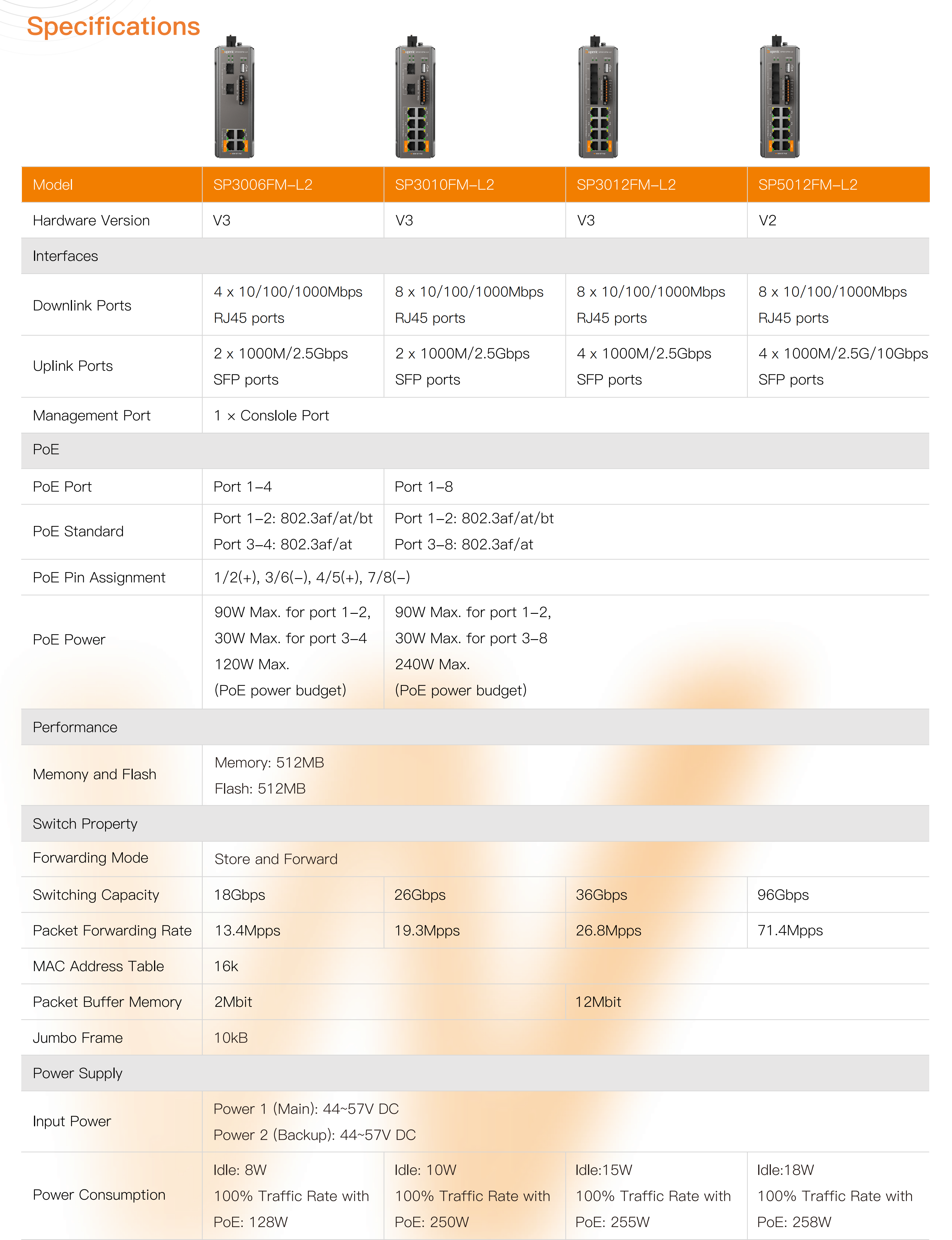 ● 2*10/100/1000 Base-T PoE++ RJ-45 ports,2*10/100/1000 Base-T PoE+ RJ-45 ports and 2*1000/2500 Base-X SFP slots