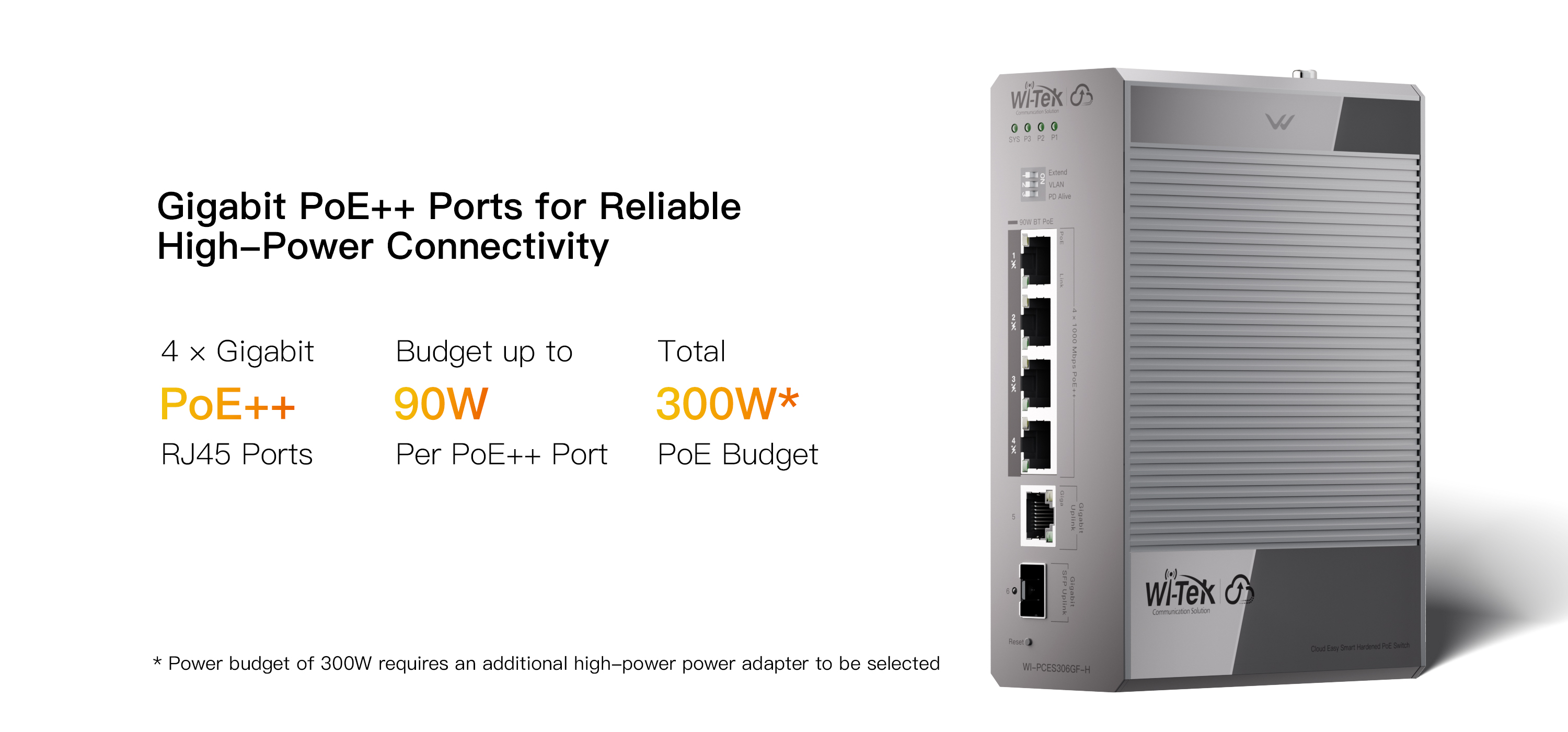 ● 4*10/100/1000Mbps PoE++ ports, 1*10/100/1000Mbps RJ45 Uplink port and 1*1000Mbps SFP slot