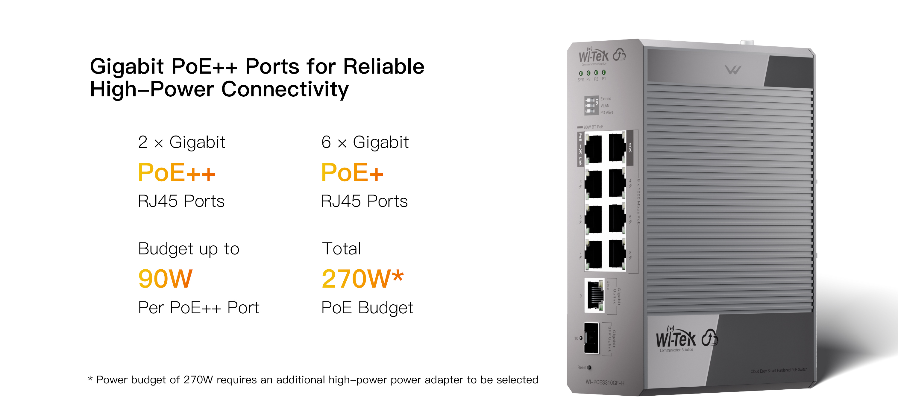 ● Port 1-2: 802.3af/at/bt PoE++ 90W, Port 3-8: 802.3af/at PoE+ 30W