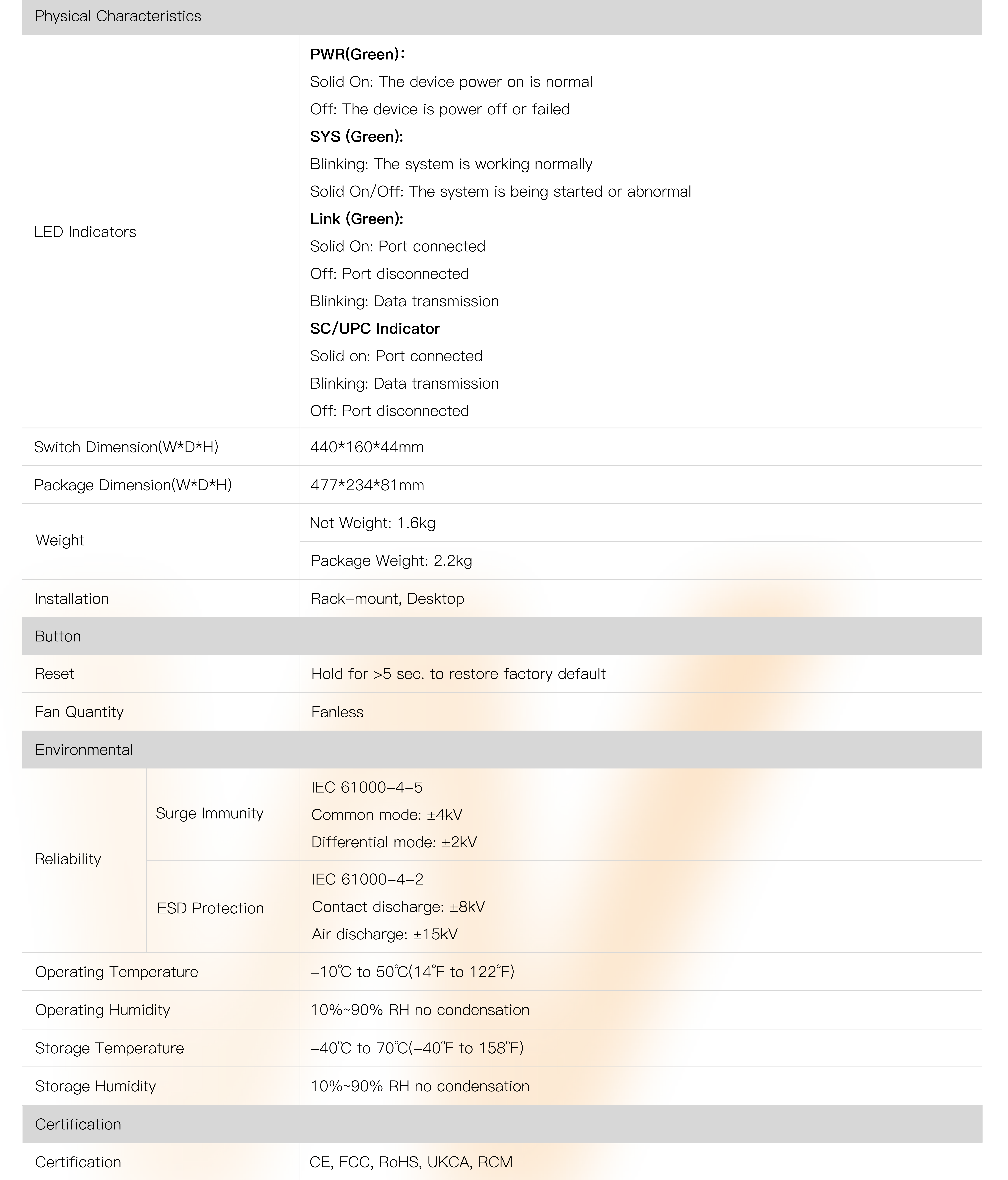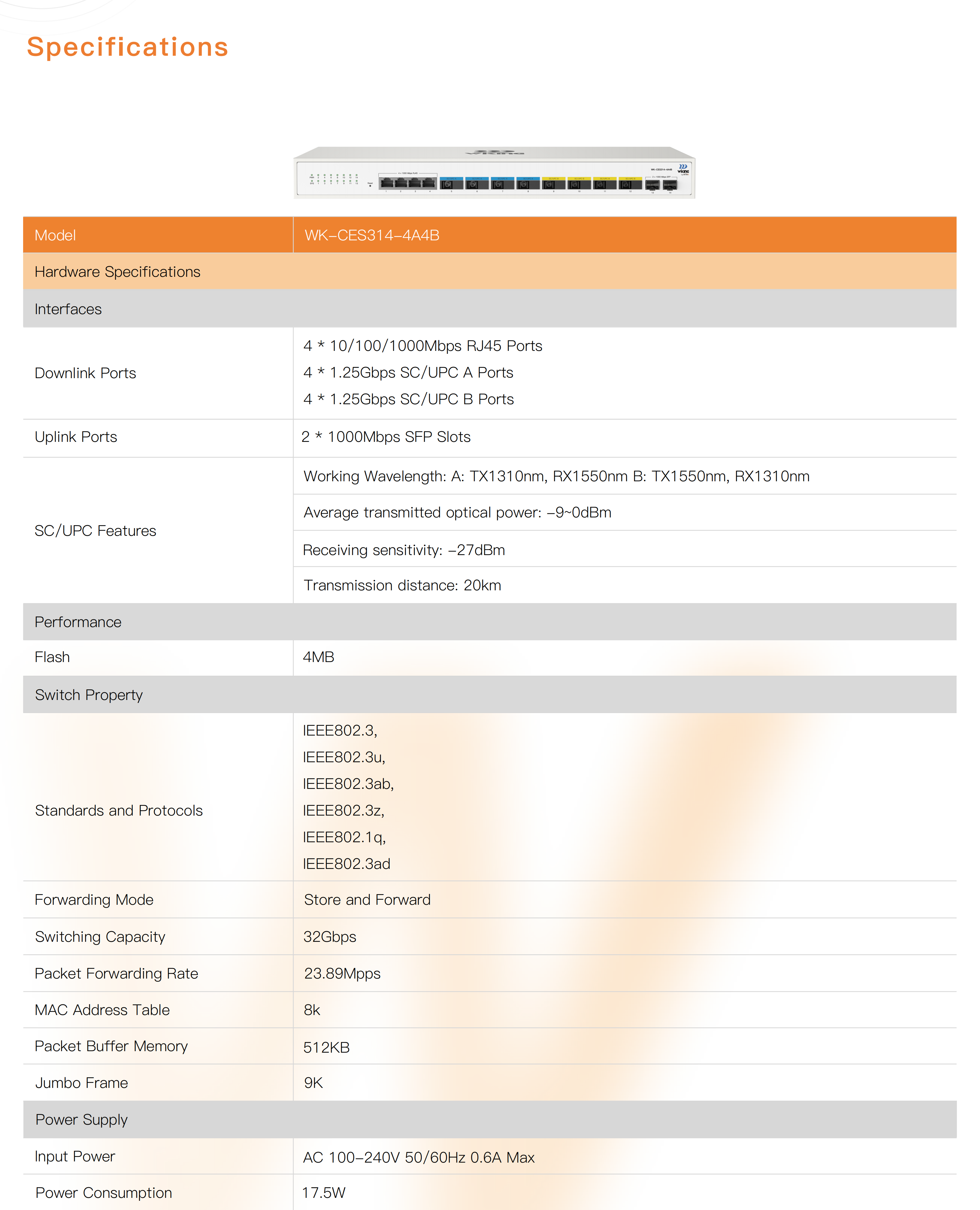 ● 4*10/100/1000Mbps RJ45 ports, 2*1000Mbps Uplink SFP Slots