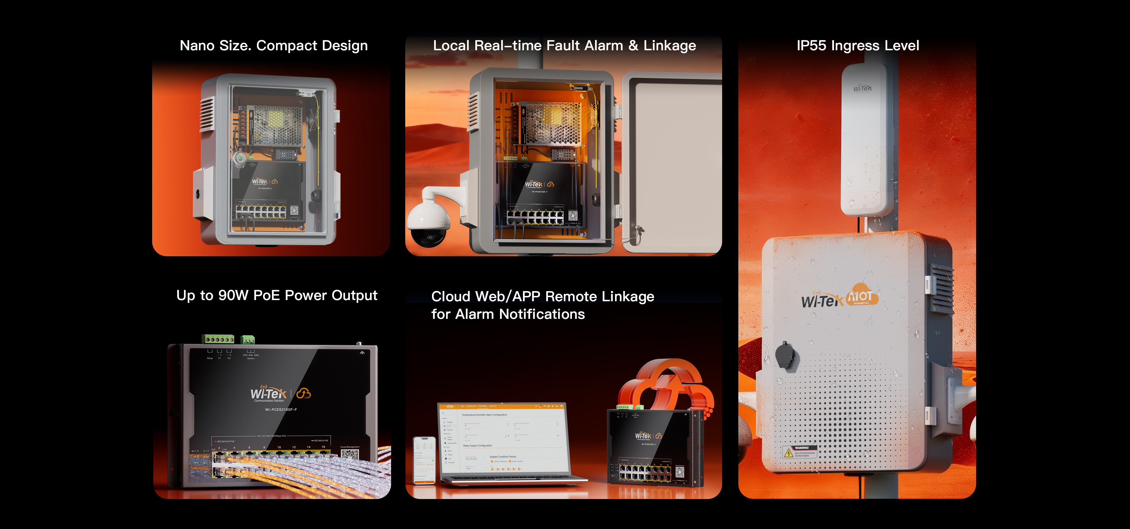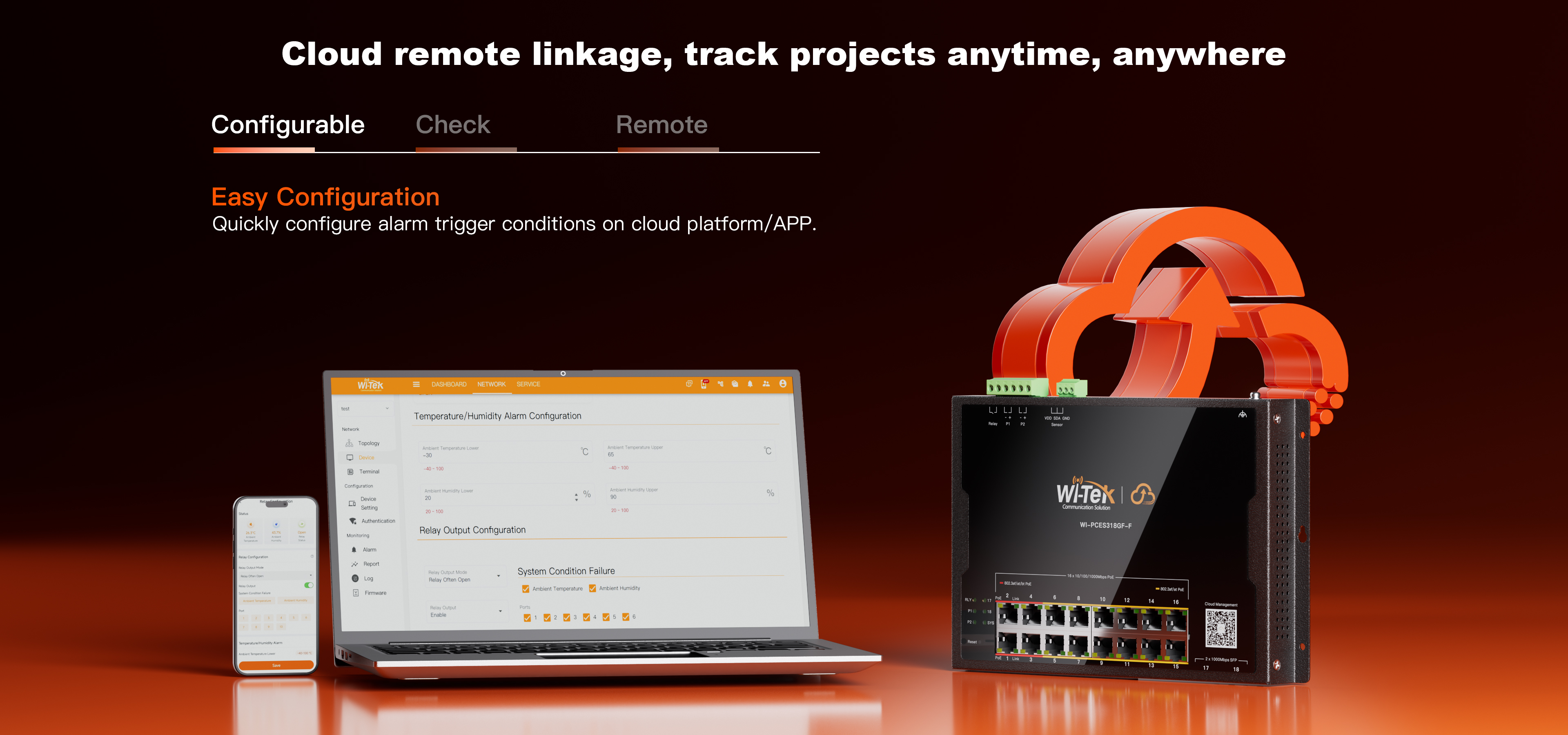 ● Cloud remote management: You can monitor the status of the box (such as temperature and humidity, fan status), manage and configure switch ports and PoE switches through Wi-Tek Cloud WEB and APP. (Need to access to Internet, router/gateway is not included)